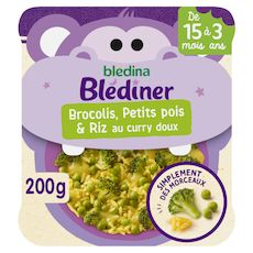 Expert de la diversification alimentaire depuis plus de 100 ans, Blédina vous accompagne pour tous les repas de votre bébé. Notre mission ? Eveiller sa curiosité pour le manger vrai, grâce à plus de 250 recettes conçues par des nutritionnistes et parfaitement adaptées à ses besoins. Découvrez le nouveau petit plat Blédina MORCEAUX À DEVORER Brocolis, Petits pois, riz aux épices douces. Un plat complet pour le soir composé d'ingrédients parfaitement reconnaissables pour apprendre à votre bébé à manger progressivement comme un grand, de 15 mois à 3 ans. Bébé est-il prêt ? Proposez lui ce petit plat uniquement s'il : - Se tient assis et se déplace tout seul - Mange des plats avec des morceaux plus ou moins fondants - Mange un quignon de pain