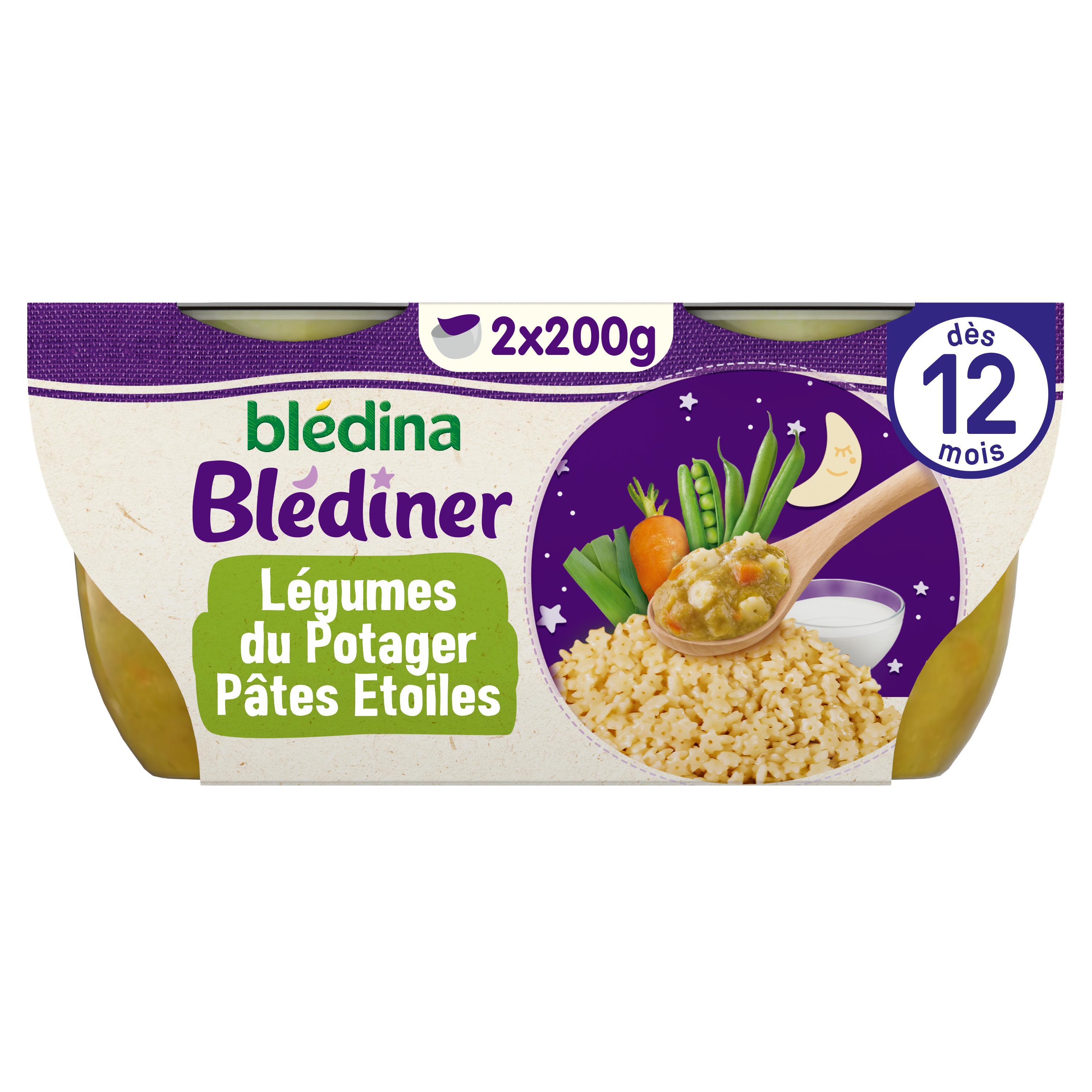 Expert de la diversification alimentaire depuis plus de 100 ans, Blédina vous accompagne pour tous les repas de votre bébé. Notre mission ? Eveiller sa curiosité pour le manger vrai, grâce à plus de 250 recettes conçues par des nutritionnistes et parfaitement adaptées à ses besoins. Blédina Blédiner - Légumes du Potager Pâtes Etoiles dès 12 mois. Découvrez ces savoureuses recettes BLEDINA pour le dîner de bébé. Des petits plats bébé à donner à la cuillère qui associent des légumes et des féculents variés, à une touche de lait pour la douceur.