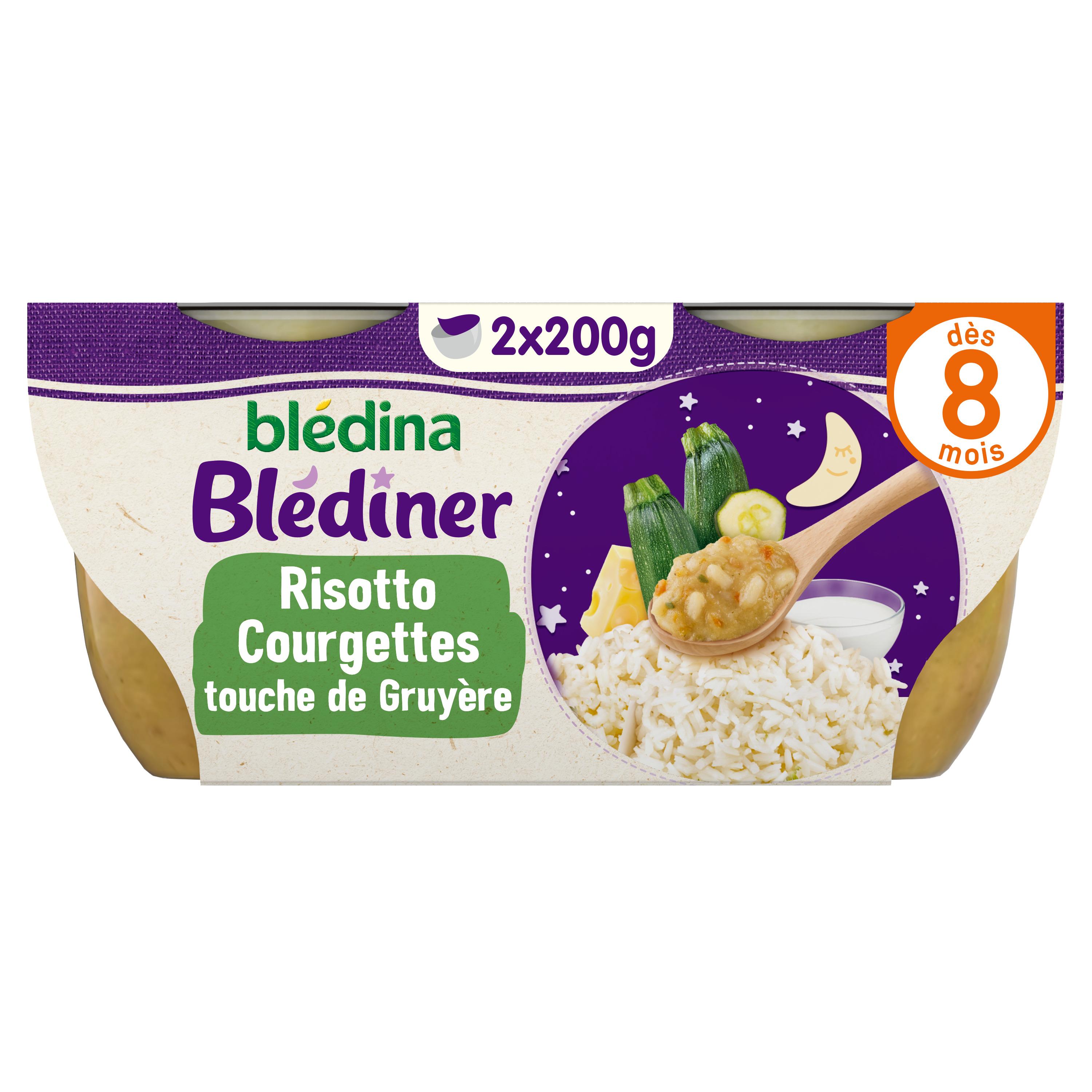 Expert de la diversification alimentaire depuis plus de 100 ans, Blédina vous accompagne pour tous les repas de votre bébé grâce à plus de 250 recettes conçues par des nutritionnistes et parfaitement adaptées à ses besoins*. Blédina Blédiner - Risotto de Courgettes Touche de Gruyère dès 8 mois. Découvrez ces savoureuses recettes BLEDINA pour le dîner de bébé sans sel ajouté ! . Des petits plats avec des petits morceaux fondants, et une délicieuse association des légumes, féculents et une touche de lait pour la douceur. *Selon la réglementation de l'alimentation infantile.