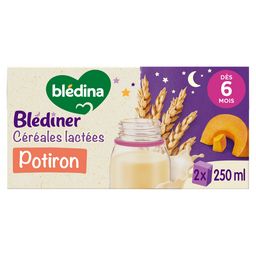 BLEDINER 2x250mL Potiron - Céréales lactées dès 6 mois. Pour varier de ses dîners habituels, découvrez une gamme de savoureuses céréales lactées adaptées aux besoins de bébé1 pour le dîner. BLEDINER Courgettes, c'est un savoureux dîner complet pour bébé avec un apport lacté adapté2, des céréales et des légumes au goût tout doux ! Et le tout dans un format pratique & prêt à l'usage ! 1 Conformément à la réglementation de l'alimentation infantile 2Un apport lacté adapté qui participe à la couverture des besoins de bébé en calcium, fer et omega 3 (Acide alpha-linolénique). Nouvelle recette : consultez la liste d'ingrédients.