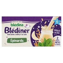BLEDINER 2x250mL Epinards - Céréales lactées dès 6 mois. Pour varier de ses dîners habituels, découvrez une gamme de savoureuses céréales lactées adaptées aux besoins de bébé1 pour le dîner. BLEDINER Epinards, c'est un savoureux dîner complet pour bébé avec un apport lacté adapté2, des céréales et des légumes au goût tout doux ! Et le tout dans un format pratique & prêt à l'usage ! 1 Conformément à la réglementation de l'alimentation infantile 2Un apport lacté adapté qui participe à la couverture des besoins de bébé en calcium, fer et omega 3 (Acide alpha-linolénique)
