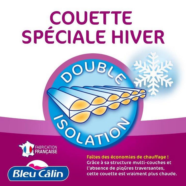 En savoir +La couette Hiver Bleu Câlin en 140x200 vous offrira un pouvoir isolant et chauffant extraordinaire grâce à sa structure innovante multi-couches séparées par un vide d'air qui retient la chaleur. Ce qui en fait un garnissage de 500g/m2 (2x250g) !Vraiment plus chaude, cette couette est adaptée aux basses températures.Faites des économies de chauffage ! Fabrication française.