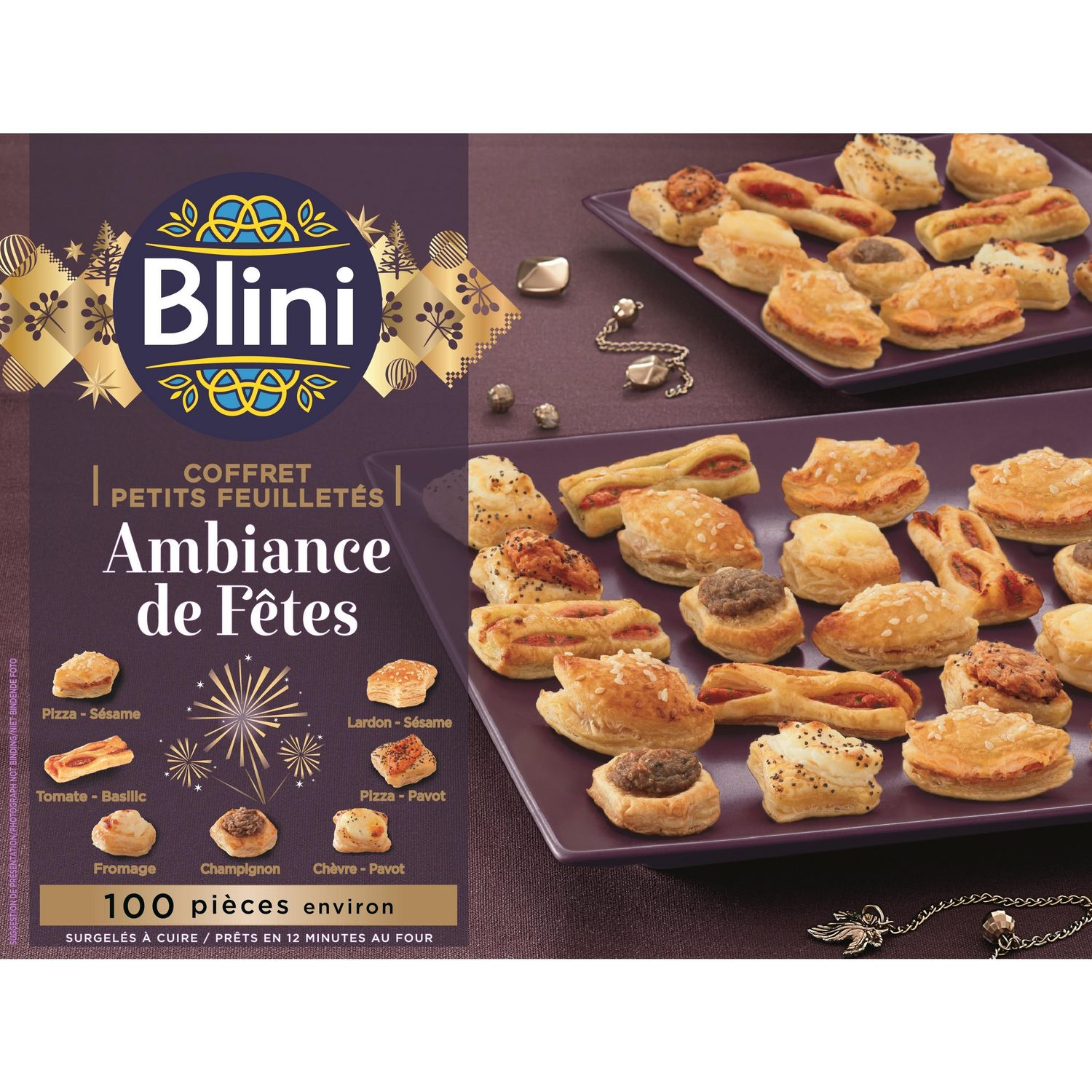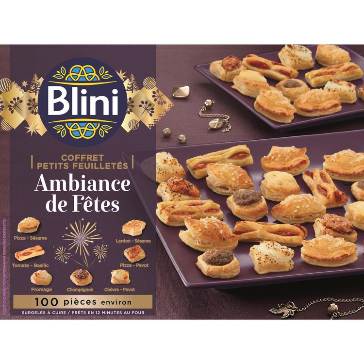 Mini-feuilleté garni d’une préparation à base de tomates en poudre, décoré de graines de sésame : eau, farine de BLÉ, margarine (graisse de palme, eau, huile de colza, sel, émulsifiant : mono- et diglycérides d'acides gras, correcteur d'acidité : acide citrique), tomates en poudre 2%*, amidon modifié, blanc d’OEUF, LAIT entier en poudre, jus concentré d’oignons, sel, graines de sésame 1%*, ail, chapelure (farine de BLÉ, eau, sel, levure), arôme naturel, OEUF entier en poudre, herbes de Provence (romarin, sarriette, marjolaine, origan, basilic, thym), piment fort Allumette feuilletée garnie d’une préparation à base de poireaux et de saumon : eau, farine de BLÉ, margarine (graisse de palme, eau, huile de colza, sel, émulsifiant : mono- et diglycérides d'acides gras, correcteur d'acidité : acide citrique), poireaux 7.3%*, SAUMON Atlantique (Salmo salar) 2.6%*, SAUMON Atlantique fumé (Salmo salar) 2.6%* (SAUMON Atlantique (Salmo salar) 2.5%*, sel), LACTOSÉRUM, amidon modifié, chapelure (farine de BLÉ, eau, sel, levure), sel, huile de colza, amidon de BLÉ, OEUF entier en poudre, LAIT entier en poudre, LAIT écrémé en poudre, épaississant : alginate de sodium ; sirop de glucose, poivre, protéines de LAIT, arômes naturels, estragon, muscade Allumette feuilletée garnie d’une préparation à base de chorizo précuit : farine de BLÉ, purée de tomates, eau, chorizo précuit 16.5%* (viande de porc (origine France) 15.2%*, épices et plantes aromatiques, sel, dextrose, arômes naturels, émulsifiant : diphosphates, antioxydant : acide ascorbique, conservateur : nitrite de sodium), margarine (graisse de palme, eau, huile de colza, sel, émulsifiant : mono- et diglycérides d'acides gras, correcteur d'acidité : acide citrique), sel, paprika, OEUF entier en poudre, piment fort Mini-feuilleté garni d’une préparation à base de fromages : eau, farine de BLÉ, margarine (graisse de palme, eau, huile de colza, sel, émulsifiant : mono- et diglycérides d'acides gras, correcteur d'acidité : acide citrique), EMMENTAL 9.4%*, LACTOSÉRUM, amidon modifié, sel, FROMAGES fondus en poudre 0.7%* (FROMAGES 0.6%*, sel de fonte : citrates de sodium ; sel), OEUF entier, huile de colza, amidon de BLÉ, OEUF entier en poudre, épaississants : méthylcellulose, alginate de sodium ; LAIT écrémé en poudre, sirop de glucose, protéines de LAIT, arômes naturels, poivre, muscade Mini-feuilleté garni d’une préparation à base de tomates en poudre, décoré de graines de pavot : eau, farine de BLÉ, margarine (graisse de palme, eau, huile de colza, sel, émulsifiant : mono- et diglycérides d'acides gras, correcteur d'acidité : acide citrique), LACTOSÉRUM, tomates en poudre 2.1%*, amidon modifié, graines de pavot 1.2%*, sel, chapelure (farine de BLÉ, eau, sel, levure), oignons, LAIT entier en poudre, OEUF entier en poudre, arôme naturel, blanc d’OEUF, ail, herbes de Provence (romarin, sarriette, marjolaine, origan, basilic, thym), poivre, épaississant : gomme xanthane ; muscade Mini-feuilleté garni d’une préparation à base de fromage de chèvre, décoré de graines de pavot : eau, farine de BLÉ, margarine (graisse de palme, eau, huile de colza, sel, émulsifiant : mono- et diglycérides d'acides gras, correcteur d'acidité : acide citrique), FROMAGE de chèvre 15%*, LACTOSÉRUM, amidon modifié, graines de pavot 1.2%*, sel, LAIT entier en poudre, OEUF en poudre, épaississant : gomme xanthane ; poivre, muscade Mini-feuilleté garni d’une préparation à base de lardon cuit fumé, décoré de graines de sésame :eau, farine de BLÉ, margarine (graisse de palme, eau, huile de colza, sel, émulsifiant : mono- et diglycérides d'acides gras, correcteur d'acidité : acide citrique), lardon cuit fumé 6.4%* (poitrine de porc 6.1%*, sel, dextrose, acidifiant : acide citrique, conservateur : nitrite de sodium, antioxydant : érythorbate de sodium), LACTOSÉRUM, BEURRE, amidon modifié, sel, chapelure (farine de BLÉ, eau, sel, levure), graines de sésame 1