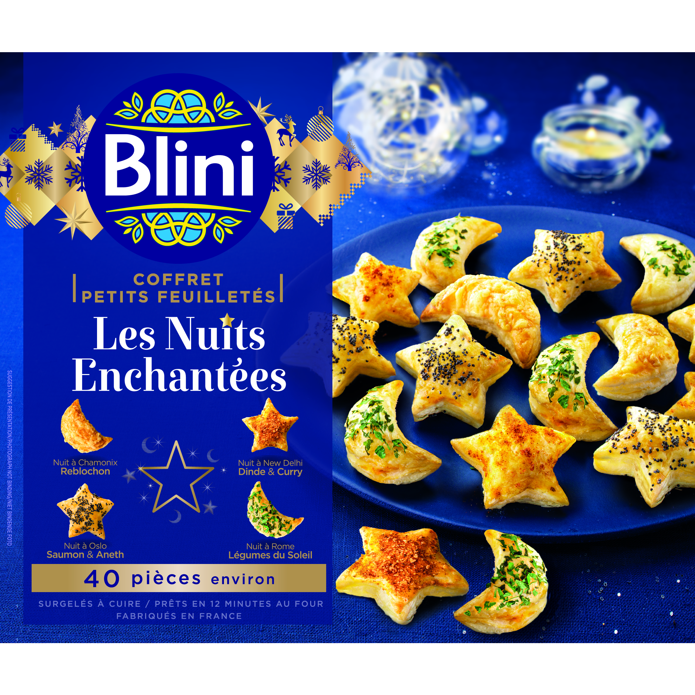 Mini-feuilleté garni d’une préparation à base de reblochon : farine de BLE, eau, margarine (graisse de palme, eau, huile de colza, sel, émulsifiants : mono-et diglycérides d'acides gras, correcteur d'acidité : acide citrique), reblochon 8,0%*(LAIT cru de vache, sel, ferments lactiques, présure, colorant : norbixine de rocou), chapelure (farine de BLE, eau, sel, levure), oignon, lactosérum en poudre (LAIT), vin blanc (contient ANHYDRIDE SULFUREUX), amidon modifié, sel, OEUF en poudre, BEURRE, LAIT entier en poudre, méthylcellulose, arôme naturel. Mini-feuilleté garni d’une préparation à base de viande poulet cuite traitée en salaison, de lait de coco et de curry : farine de BLE, margarine (graisse de palme, eau, huile de colza, sel, émulsifiants : mono-et diglycérides d'acides gras, correcteur d'acidité : acide citrique), eau, viande de poulet cuite traitée en salaison 9,8%* (viande de poulet 9,3%* (origine France), protéines de LAIT, sel, LACTOSE), oignon, lait de coco en poudre 3,2%*(lait de noix de coco, maltodextrine, caséinates (LAIT) de sodium), chapelure (farine de BLE, eau, sel, levure), huile d'olive vierge extra, ail, sel, paprika, coriandre, ŒUF en poudre, curry 0,4%* (gingembre, poivre, curcuma, fenugrec, paprika, coriandre), jus de citron, mélange d'épices (poivre blanc, poivre noir, piment, baies roses, poivre vert), extrait de curcuma. Mini-feuilleté garni d’une préparation à base de saumon : farine de BLE, eau, margarine (graisse de palme, eau, huile de colza, sel, émulsifiants : mono-et diglycérides d'acides gras, correcteur d'acidité : acide citrique), saumon Atlantique fumé 6,6%*(SAUMON Atlantique (salmo salar), sel), courgette, graine de pavot 2,3%*, lactosérum en poudre (LAIT), SAUMON Atlantique (salmo salar) 1,7%*, amidon modifié, sel, ŒUF en poudre, purée de citron confit au gingembre (citron confit au sel, huile de tournesol, gingembre, vinaigre d'alcool, épices), persil, LAIT entier en poudre, aneth 0,08%*. Mini-feuilleté garni d’une préparation à base de poivron, tomate, courgette et aubergine : farine de BLE, margarine (graisse de palme, eau, huile de colza, sel, émulsifiants : mono-et diglycérides d'acides gras, correcteur d'acidité : acide citrique), eau, aubergine 4,6%* (aubergine, huile de tournesol), purée de tomate 3,8%*, ail, courgette 2,2%*, poivron rouge 2,0%*, poivron jaune grillé 2,0%*(poivron jaune, huile de tournesol), huile d'olive vierge extra, oignon préfrit (oignon, huile végétale), sel, basilic, lactosérum en poudre (LAIT), amidon modifié, persil, ŒUF en poudre, LAIT entier en poudre, piment d’Espelette. *Pourcentages exprimés sur chaque mini-feuilletés. Traces éventuelles de céleri, crustacés, fruits à coque, graines de sésame, mollusques, moutarde et soja.