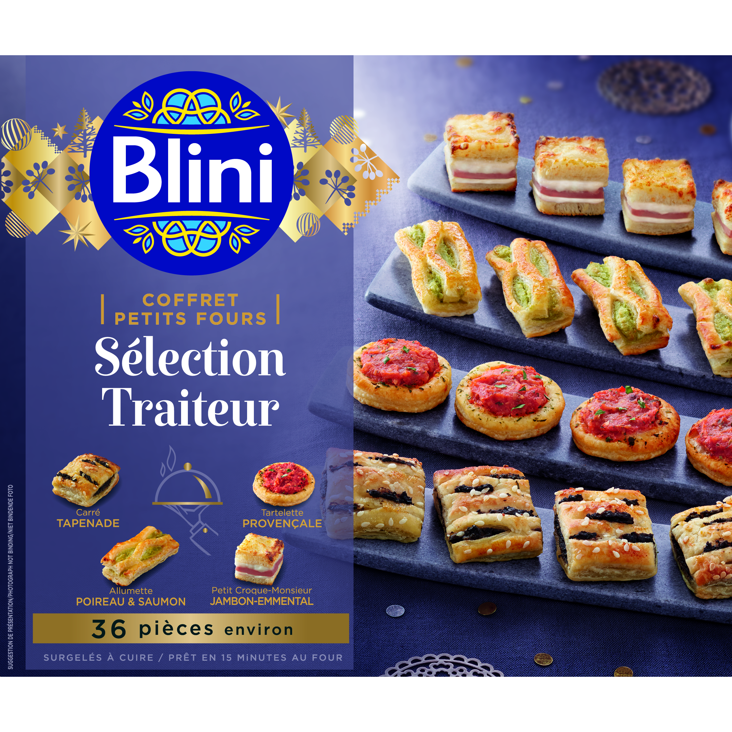 Carré feuilleté garni d’une préparation à base de tapenade : farine de BLE, tapenade 27%* [olive noire confite dénoyautée 23%* (olive 11%*, eau, sel, stabilisant : gluconate ferreux), câpres fines au vinaigre 3,1%* (câpres 1,7%, eau, vinaigre, sel), huile d'olive vierge extra 1,8%*, ANCHOIS salés à l'huile 1,5%* (ANCHOIS salés (engraulis encrasicolus) 1%*, huile de tournesol), thym 0,3%*], eau, margarine (huiles végétales de palme et de colza, eau, sel, émulsifiants : mono- et diglycérides d'acides gras ; acidifiant : acide citrique), lactosérum (LAIT), amidon modifié, graines de SESAME, sel, amidon de BLE, matière grasse végétale de colza, OEUF en poudre, LAIT écrémé en poudre, épaississant : alginate de sodium ; sirop de glucose, protéine de LAIT, arômes naturels, poivre, muscade. Tartelette à base de pâte brisée garnie d’une préparation à base d’oignon, de tomate et d’herbes de Provence : farine de BLE, oignon 21%*, eau, margarine (huiles végétales de palme et de colza, eau, sel, émulsifiants : mono- et diglycérides d'acides gras ; acidifiant : acide citrique), purée de tomate 8,6%*, EMMENTAL, PARMESAN, amidon modifié, sel, persil 0,4%*, OEUF en poudre, herbes de Provence 0.1%* (romarin, sarriette, marjolaine, origan, basilic, thym). Allumette feuilletée garnie d’une préparation à base de poireau et de saumon : eau, farine de BLE, BEURRE, poireau 7%*, SAUMON Atlantique (salmo salar) 2,5%*, SAUMON Atlantique fumé (salmo salar) 2,5%* (SAUMON Atlantique (salmo salar) 2,4%*, sel), lactosérum (LAIT), amidon modifié, chapelure (farine de BLE, eau, sel, levure), sel, LAIT écrémé en poudre, OEUF en poudre, amidon de BLE, matière grasse végétale de colza, épaississant : alginate de sodium ; sirop de glucose, poivre, protéine de LAIT, arômes naturels, estragon, muscade. Petit croque monsieur à base de jambon cuit choix et d’emmental : eau, pain de mie 28%* (farine de BLE, eau, LAIT entier en poudre, levure, sel, gluten de BLE, huile d'olive vierge extra, émulsifiants : mono- et diglycérides d'acides gras, esters monoacétyltartriques et diacétyltartriques des mono- et diglycérides d'acides gras; farine de BLE malté, agent de traitement de la farine : acide ascorbique), jambon cuit choix 20%* (jambon de porc (origine : UE) 17%*, eau, sel, arômes naturels, concentré de jus de légumes en poudre (carotte, blette), ferments), EMMENTAL 11%*, farine de BLE, BEURRE, LAIT écrémé en poudre, sel, poivre. *Pourcentages exprimés sur chaque petit four.