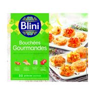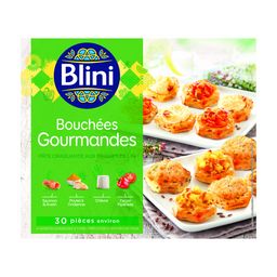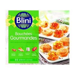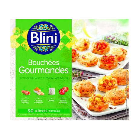 Petit four garni d'une préparation à base de viande de poulet et de curry : farine de BLÉ, eau, margarine (graisse de palme, eau, huile de colza, sel, émulsifiants : mono- et diglycérides d'acides gras, correcteur d'acidité : acide citrique), viande de poulet cuite 10%* (viande de poulet (origine : France), protéines de LAIT, sel, LACTOSE), poivron rouge, oignon, raisin sec, graines de lin 2,3%*, lactosérum en poudre (LAIT), amidon, gingembre, sel, OEUF en poudre, mélange d'épices curry 0,2%, LAIT entier en poudre, huile de tournesol, épices (contient SULFITES) (girofle, muscade, cannelle, gingembre). Petit four garni d'une préparation à base de saumons et d'aneth : farine de BLÉ, eau, SAUMON Atlantique (salmo salar) 14%*, margarine (graisse de palme, eau, huile de colza, sel, émulsifiants : mono- et diglycérides d'acides gras, correcteur d'acidité : acide citrique), vin blanc (contient SULFITES), échalote, graines de lin 2,3%*, CRÈME fraîche, jus de citron, saumon Atlantique fumé 1,9%* (SAUMON Atlantique (salmo salar), sel), lactosérum en poudre (LAIT), amidon, BEURRE, sel, aneth 0,5%*, OEUF en poudre, LAIT entier en poudre, arôme naturel. Petit four garni d'une préparation à base de tomate, poivron et d'oignon : farine de BLÉ, eau, margarine (graisse de palme, eau, huile de colza, sel, émulsifiants : mono- et diglycérides d'acides gras, correcteur d'acidité : acide citrique), poivron rouge 8,7%*, purée de tomate 8,0%*, pulpe de tomate au jus 8,0%* (tomate 5,3%*, jus de tomate 2,6%*, sel, acidifiant : acide citrique, stabilisant : chlorure de calcium), oignon 5,6%*, graines de lin 2,3%*, amidon, BEURRE, huile d'olive vierge extra, basilic, purée d'ail, sel, OEUF en poudre, épaississant : méthylcellulose ; poivre. Petit four garni d'une préparation à base de fromage de chèvre : eau, farine de BLÉ, margarine (graisse de palme, eau, huile de colza, sel, émulsifiants : mono- et diglycérides d'acides gras, correcteur d'acidité : acide citrique), FROMAGE de chèvre 13%*, lactosérum en poudre (LAIT), amidon, graines de lin 2,3%*, sel, LAIT entier en poudre, OEUF en poudre, épices (contient SULFITES) (girofle, muscade, cannelle, gingembre). *Pourcentages exprimés sur chaque petit four.