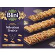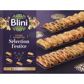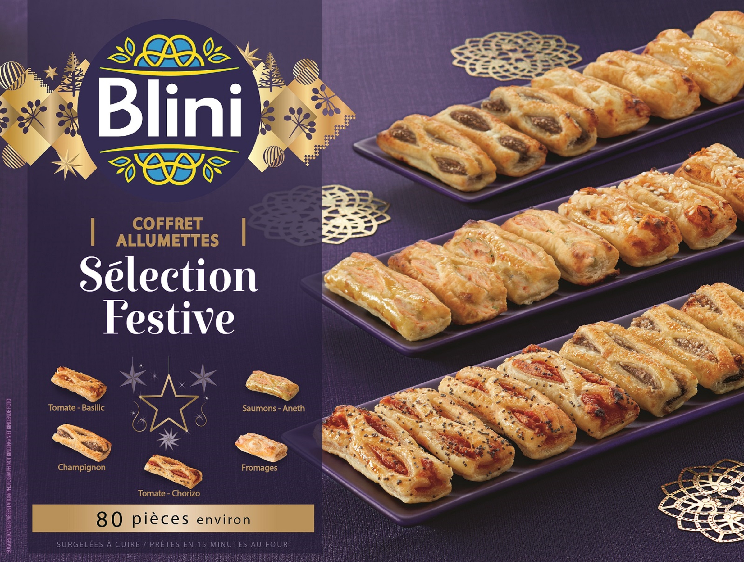 Allumette de pâte feuilletée garnie d'une préparation à base de tomate et de basilic : farine de BLE, purée de tomate 20,6%*, margarine (graisse de palme, eau, huile de colza, sel, émulsifiants : mono- et diglycérides d'acides gras ; correcteur d'acidité : acide citrique), eau, oignon, jus de tomate 3,5%*, amidon, graines de SESAME, basilic 1,3%*, purée d'ail, sel, huile d'olive vierge extra, OEUF en poudre, acidifiant : acide citrique ; stabilisant : chlorure de calcium. Allumette de pâte feuilletée garnie d'une préparation à base de champignon de Paris : farine de BLE, eau, champignons de Paris 18,0%*, margarine (graisse de palme, eau, huile de colza, sel, émulsifiants : mono- et diglycérides d'acides gras ; correcteur d'acidité : acide citrique), CREME, échalote, amidon, sel, huile d'olive vierge extra, chapelure 0,9%* (farine de BLE, eau, sel, levure), OEUF en poudre, épaississant : méthylcellulose ; stabilisant : carraghénanes. Allumette de pâte feuilletée garnie d'une préparation à base de tomate et de chorizo précuit : farine de BLE, eau, purée de tomate 17,1%*, margarine (graisse de palme, eau, huile de colza, sel, émulsifiants : mono- et diglycérides d'acides gras ; correcteur d'acidité : acide citrique), chorizo précuit 15,7%* (viande de porc, gras de porc, épices et plantes aromatiques [piments doux, fort et fumé, poivres, ail, origan, muscade, carvi, coriandre, girofle], sel), graines de pavot 0,9%*, sel, OEUF en poudre, paprika, piment. Allumette de pâte feuilletée garnie d'une préparation à base de saumons et d'aneth : farine de BLE, eau, margarine (graisse de palme, eau, huile de colza, sel, émulsifiants : mono- et diglycérides d'acides gras ; correcteur d'acidité : acide citrique), SAUMON Atlantique (Salmo salar) 13,1%*, vin blanc (contient SULFITES), échalote, CREME fraîche, jus de citron, SAUMON Atlantique fumé 1,8%* (SAUMON Atlantique (Salmo salar), sel), lactosérum en poudre (LAIT), amidon modifié, sel, BEURRE, OEUF en poudre, aneth 0,4%*, LAIT entier en poudre, arôme naturel. Allumette de pâte feuilletée garnie d'une préparation à base de fromages : eau, farine de BLE, margarine (graisse de palme, eau, huile de colza, sel, émulsifiants : monoet diglycérides d'acides gras ; correcteur d'acidité : acide citrique), EMMENTAL râpé 3,9%*, FROMAGES fondus en poudre 3,4%* (FROMAGE, sels de fonte : citrates de sodium ; sel), lactosérum en poudre (LAIT), amidon modifié, PARMESAN râpé 0,9%*, chapelure (farine de BLE, eau, sel, levure), sel, OEUF en poudre, LAIT entier en poudre, ROQUEFORT 0,3%*, blanc d'OEUF. *Pourcentages exprimés sur chaque mini-feuilleté