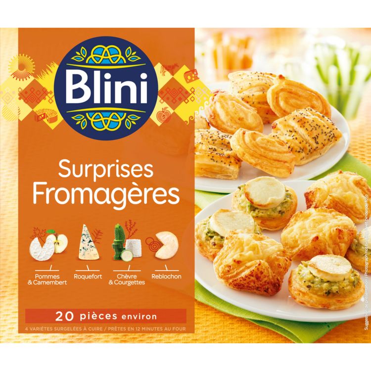 Mini panier feuilleté garni d'une préparation à base de pomme et de camembert : eau, farine de BLÉ, margarine (graisse de palme, eau, huile de colza, sel, émulsifiants : mono- et diglycérides d'acides gras, correcteur d'acidité : acide citrique), pomme 11,1%*, CAMEMBERT 9,2%*, lactosérum en poudre (LAIT), amidon, chapelure (farine de BLÉ, eau, sel, levure), sel, LAIT entier en poudre, OEUF en poudre, antioxydant : acide ascorbique ; correcteur d'acidité : acide citrique. Carré feuilleté garni d'une préparation à base de roquefort : eau, farine de BLÉ, margarine (graisse de palme, eau, huile de colza, sel, émulsifiants : mono- et diglycérides d'acides gras, correcteur d'acidité : acide citrique), ROQUEFORT 10,1%*, lactosérum en poudre (LAIT), amidon, raisin sec, graines de pavot, sel, LAIT entier en poudre, OEUF en poudre, huile de tournesol. Tartelette feuilletée garnie d'une préparation à base de courgette et de fromage de chèvre : courgette 27,9%*, FROMAGE de chèvre 20,9%*, farine de BLÉ, eau, margarine (graisse de palme, eau, huile de colza, sel, émulsifiants : mono- et diglycérides d'acides gras, correcteur d'acidité : acide citrique), lactosérum en poudre (LAIT), amidon, huile d'olive vierge extra, sel, ail, OEUF en poudre, basilic, LAIT entier en poudre, jus de citron, thym. Roulé feuilleté garni d'une préparation à base de reblochon : eau, farine de BLÉ, margarine (graisse de palme, eau, huile de colza, sel, émulsifiants : mono- et diglycérides d'acides gras, correcteur d'acidité : acide citrique), REBLOCHON 10,8%* (LAIT de vache, sel, ferments lactiques, présure, colorant : norbixine de rocou), oignon, lactosérum en poudre (LAIT), vin blanc (contient SULFITES), amidon, sel, OEUF en poudre, BEURRE, LAIT entier en poudre, épaississant : méthylcellulose ; arôme naturel. *Pourcentages exprimés sur chaque petit four.