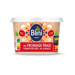 Fromage frais à 0% de matière grasse 69% (contient LAIT) - fromage frais 11% (LAIT écrémé, crème, sel, babeurre déshydraté, protéines de LAIT, ferments lactiques) - huile de colza - tomates séchées 5% (tomates, sel, sirop de glucose, acidifiants : acide citrique et acide ascorbique, conservateur : sorbate de potassium) - huile infusée au basilic 1.2% (huile de tournesol, basilic) - basilic surgelé 0.2% - persil surgelé - double concentré de tomate - tomate - sel - sucre - ail rose 0.4% - poivre en poudre - conservateur (sorbate de potassium) - épaississant (gomme xanthane).