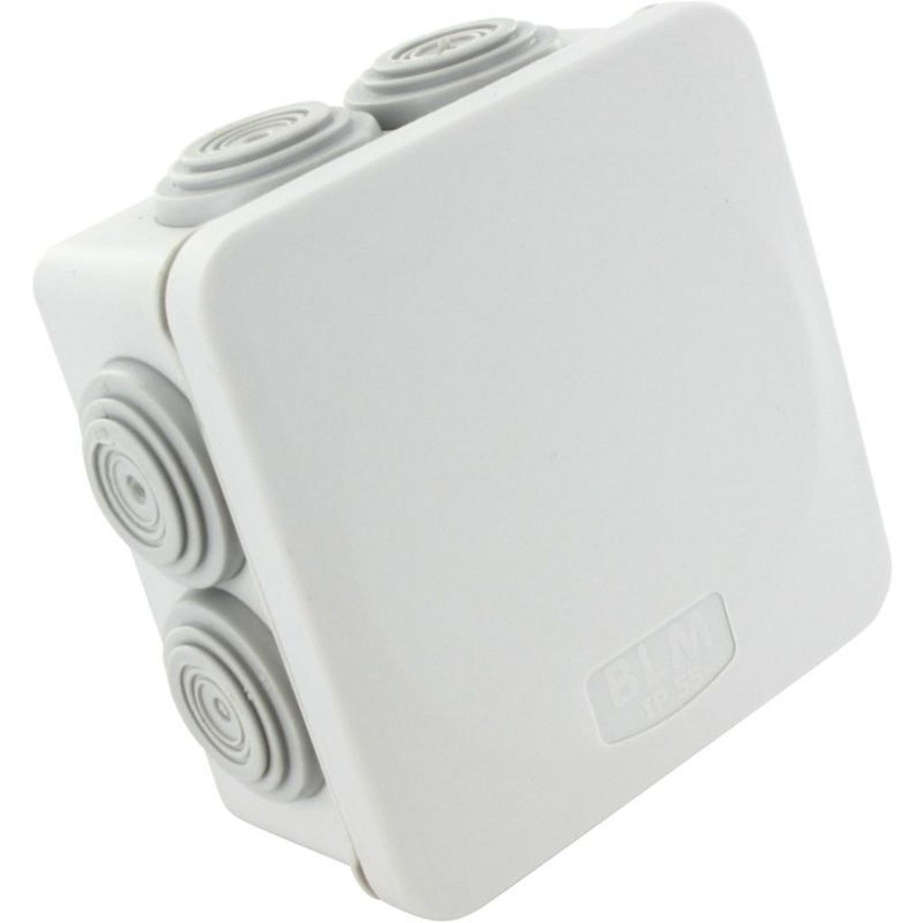 Boite de dérivation étanche 960°C BLM.Format : 80x80 mm et 35 mm de profondeur.Avec couvercle d'isolation.7 Entrées isolantes.Coloris gris.Matière plastique.IP55.