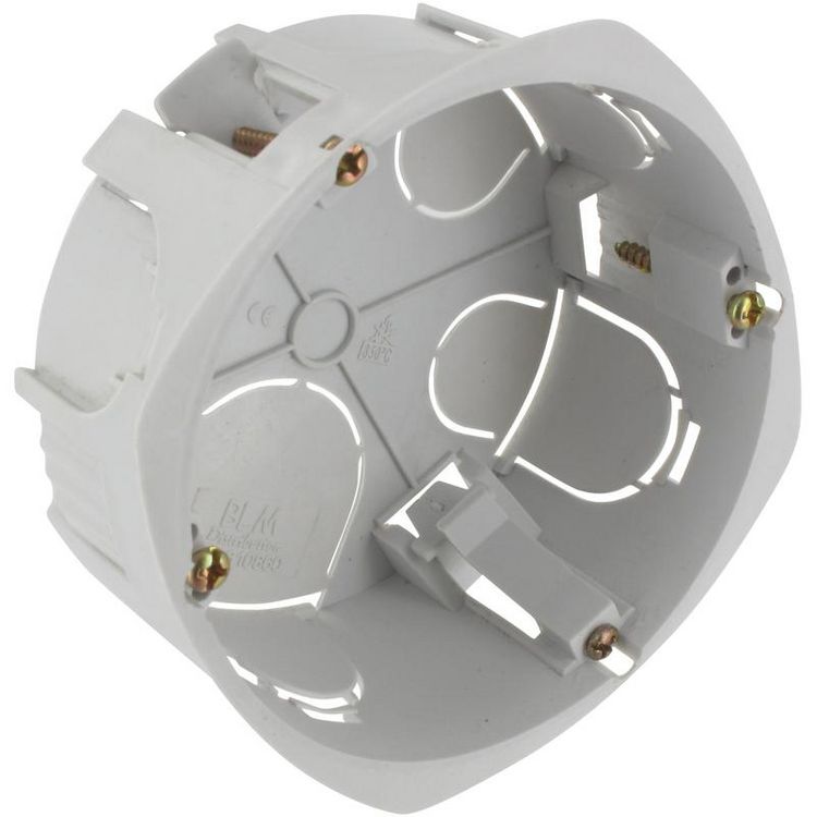 Boite d'encastrement mural BiBox BLM.Deux postes.Encastrement en cloison sèche.Dimensions : 86 mm de diamètre, 40 mm de profondeur.Réalisez vos installations électriques lors de vos travaux.Serrage à vis.Matière Plastique.Coloris Blanc.Correspond aux normes françaises.