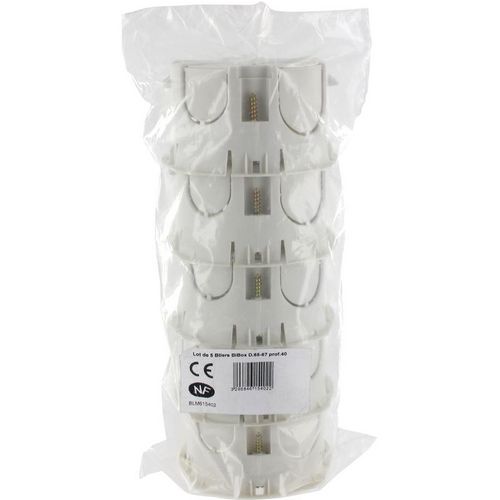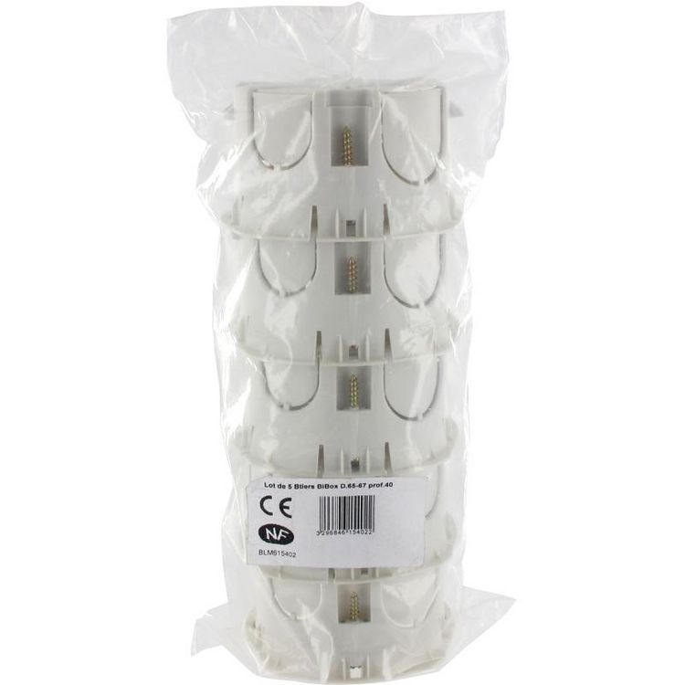 Lot de 5 boites d'encastrement mural BiBox BLM.Encastrement en cloison sèche.Dimensions : 65-67 mm de diamètre, 40 mm de profondeur.Réalisez vos installations électriques lors de vos travaux.Serrage à vis.Matière Plastique.Coloris Blanc.Correspond aux normes françaises.