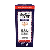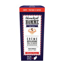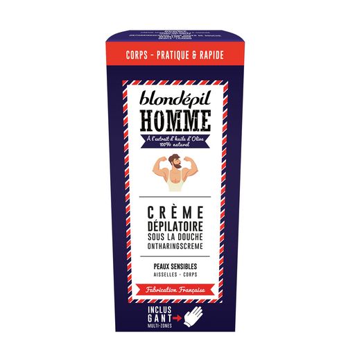 Spécialement conçue pour les poils des hommes, la crème dépilatoire Blondépil HOMME est aussi bien adaptée à l?épilation des grandes zones (torses, jambes, dos, fesses) qu?à celles des petites zones (aisselles, aine) .Sa formule enrichie en huile d?Olive nourrissante convient particulièrement aux peaux sensibles. Pratique, avec sa formule rapide et efficace en 6 min sous la douche, pour une peau nette en quelques minutes. Grâce à son gant multi-zones, la crème s?enlève rapidement et facilement sous la douche, quelle que soit la zone ! Fabrication Française.