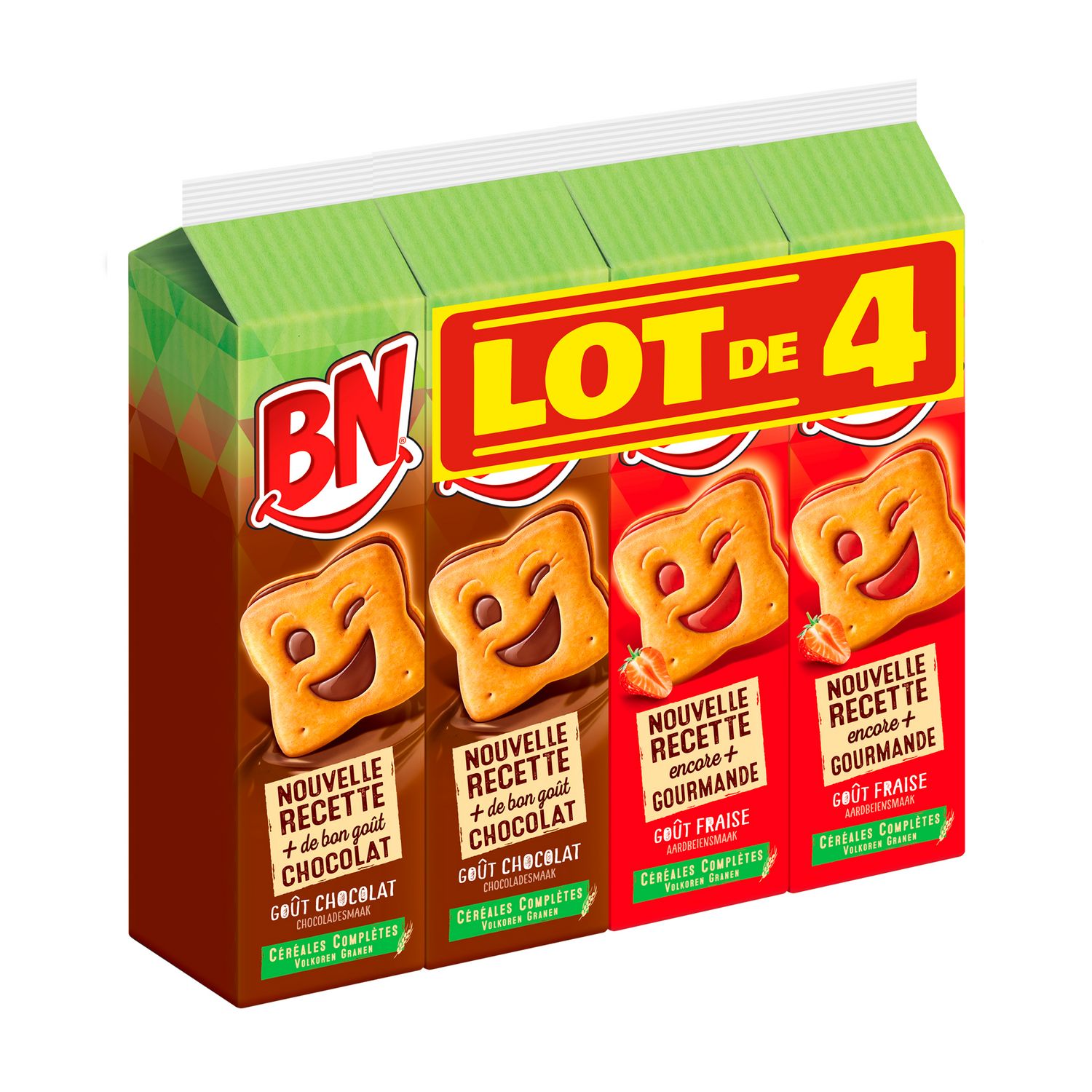 Ingrédients bn chocolat : Céréales [farine de FROMENT (33%), céréales complètes (15.1%) (farine complète de FROMENT (15 %), farine complète de SEIGLE, farine complète d’ORGE)] - sucre – matières grasses végétales (palme, palmiste, colza) – cacao maigre (4.7%) – amidons (BLE) – sirop de glucose - poudres à lever : carbonates d'ammonium et de sodium – sel - LAIT écrémé en poudre - perméat de LACTOSERUM en poudre (LAIT)– émulsifiant : lécithines de tournesol - arômes.