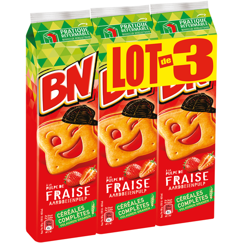 Ingrédients: CEREALES farine de FROMENT (33%), CEREALES complètes (15.1%) farine complète de FROMENT (15%) farine complète de SEIGLE, farine complète d'ORGE, sirop de glucose - fructose - sucre, matière grasse (palme) - stabilisant : glycérol - sirop de glucose - pulpe de fraise concentrée (équivalent fraise 5%) - amidon - LACTOSE, protéines de LAIT, poudres à lever ; carbonates d'ammonium et de sodium, sel, LAIT entier en poudre - acidifiants : acide citrique, citrate trisodique - colorant : rouge de betterave - gélifiant : pectine - arômes - épaississant : amidon modifié. peut contenir des traces de fruits a coque, de soja, d'oeuf, et de sesame