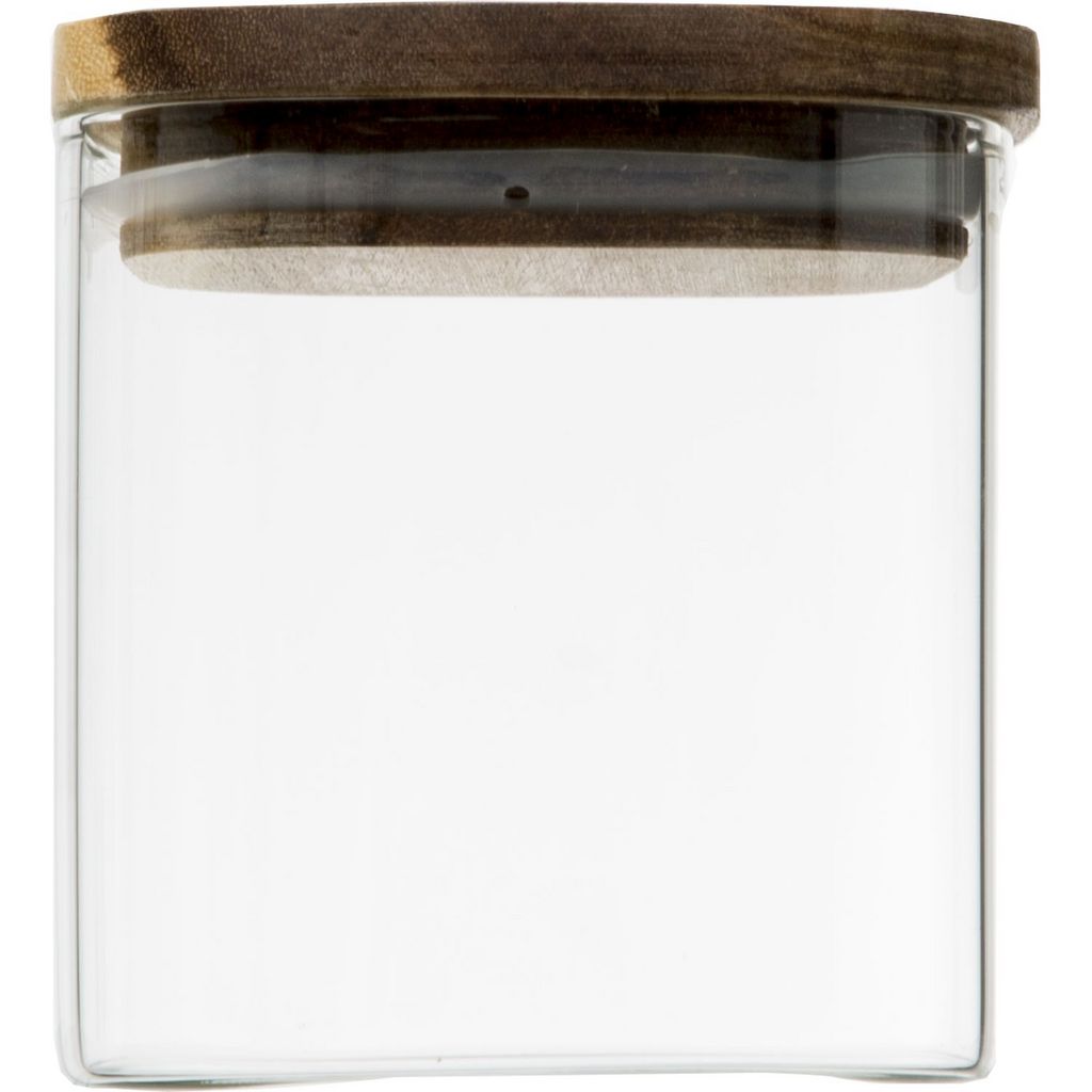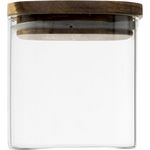 Informations Techniques : Dimensions : L. 10,5 x l. 10,5 x H. 11 cm Matière : Verre Spécificités : Pratique & Utile Bocal de Conservation Forme Carrée Contenance : 0,6 L Facile d'entretien & d'utilisation Poids : 0,28 kg Couleur : Transparent & Marron