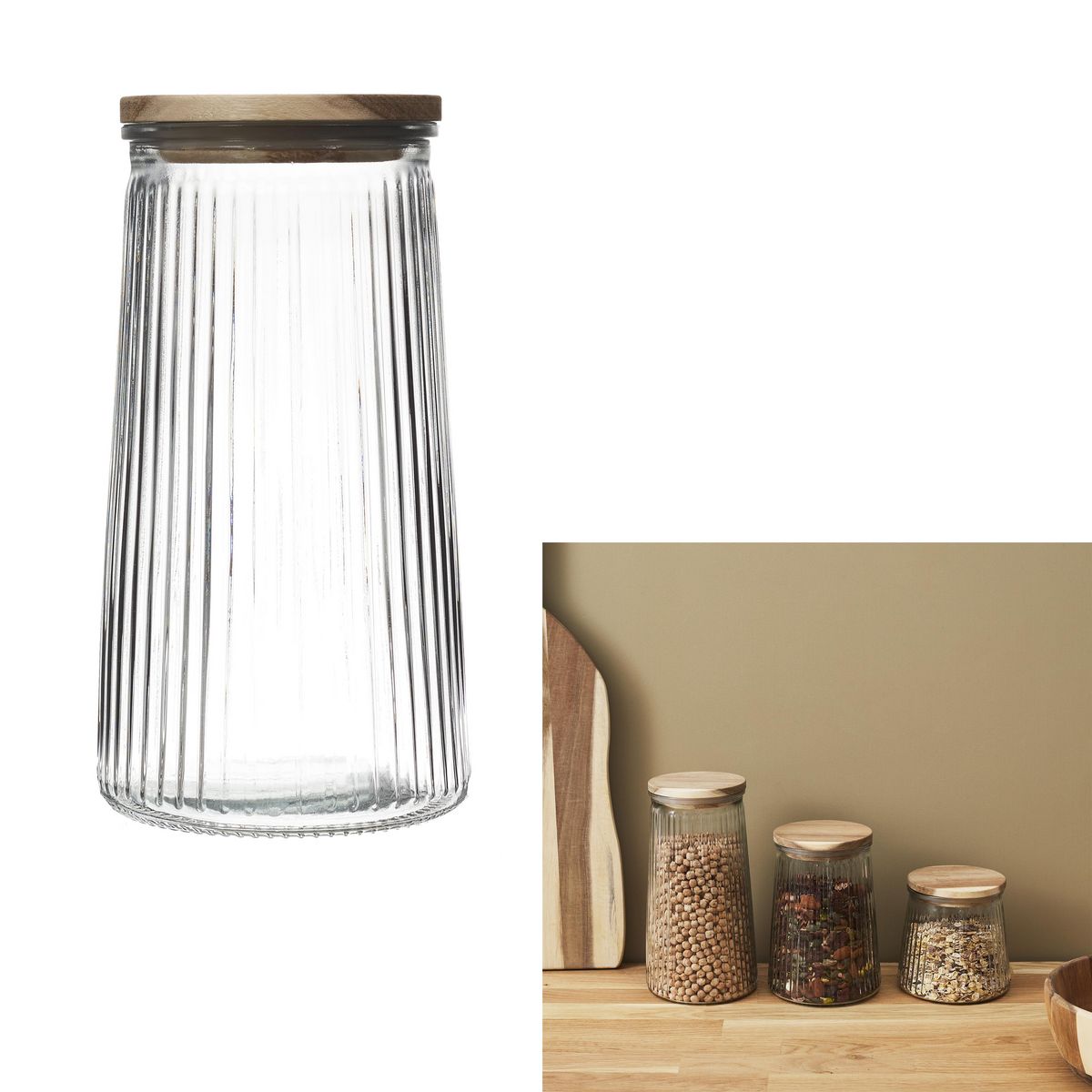 Informations Techniques : Dimensions : D. 11 x H. 21 cm Matière : Verre, Elastomère, Silicone & Bois (Acacia) Spécificités : Tendance & Chic Bocal de Conservation Forme Ronde Couvercle en Bois d'Acacia Contenance : 130 cl Poids : 0,683 kg Couleur : Transparent