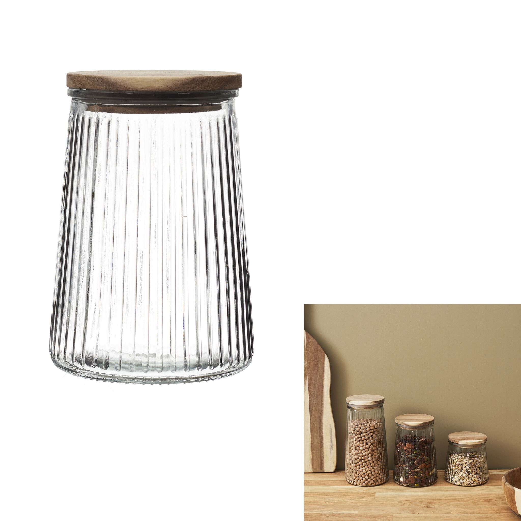 Informations Techniques : Dimensions : D. 11 x H. 16 cm Matière : Verre, Elastomère, Silicone & Bois (Acacia) Spécificités : Tendance & Chic Bocal de Conservation Forme Ronde Couvercle en Bois d'Acacia Contenance : 95 cl Poids : 0,556 kg Couleur : Transparent