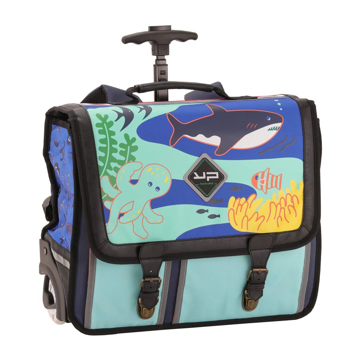 Cartable 41cm roulettes Oceanic - Décor sublimation, sérigraphie, encre phosphorescente - 2 compartiments - 2 poches volume - 1 séparation intégrale zippée - Roues nylon lumineuses - Canne télescopique 3 niveaux - Etiquette porte nom - Porte règle - Parties réfléchissantes - Dos moussé +