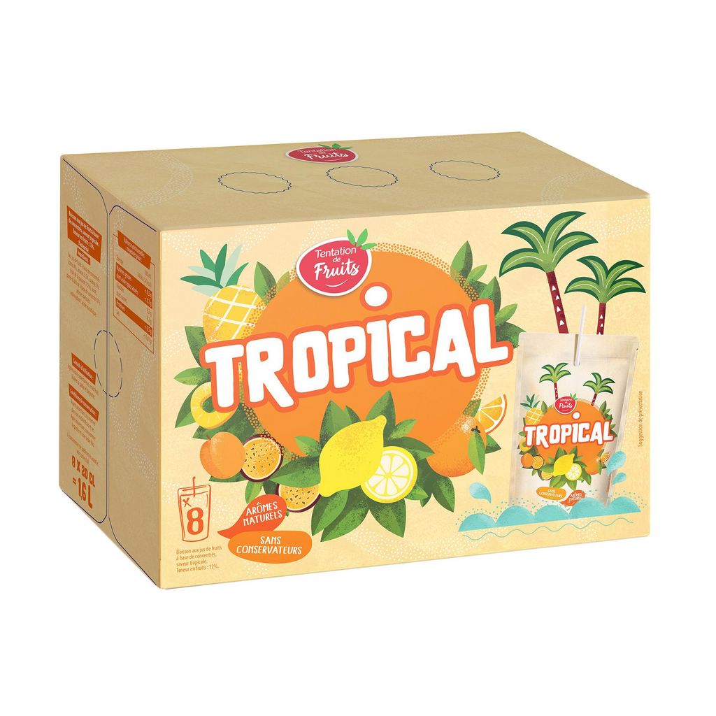 Boisson aux jus de fruits à base de concentrés, saveur tropicale. Teneur en fruits : 12%. Pasteurisé