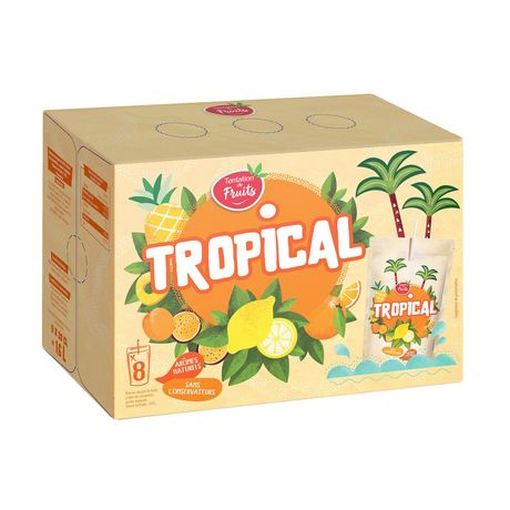 Boisson au jus de fruit goût tropical poches