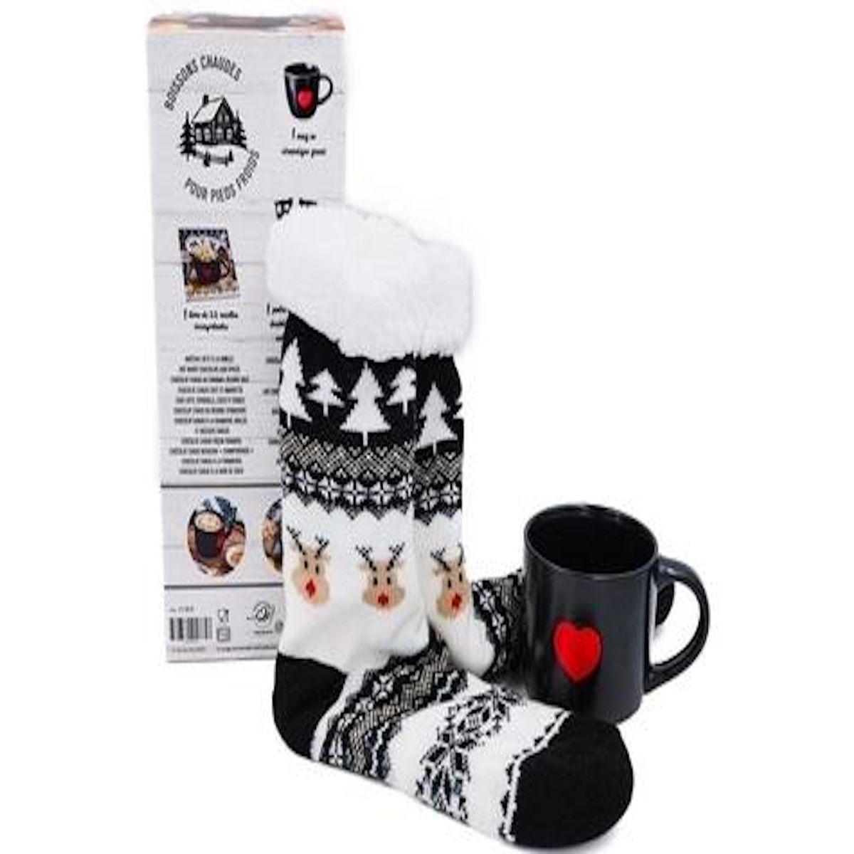 BOISSONS CHAUDES POUR PIEDS FROIDS RENNES BLACK. COFFRET AVEC 1 PAIRE DE CHAUSSETTES DOUBLEES EN POLAIRE ET ANTIDERAPANTES, 1 MUG EN CERAMIQUE GRAVE, 1 LIVRE DE 22 RECETTES RECONFORTANTES, Gaillet Emilie