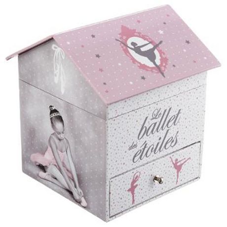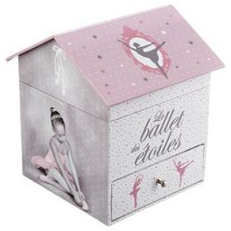 Informations Techniques : Dimensions : L. 14 x l. 14,5 H. 16 cm Matière : Carton Spécificités : Boîte Musicale Thème de la danse Contient : Une petite danseuse Un miroir en cœur Un Tiroir Poids : 0,380 kg Couleur : Rose