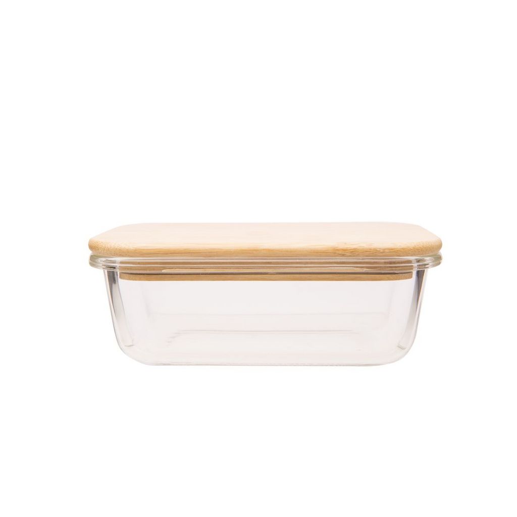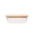 Une boîte en verre avec couvercle en bambou, 100% saine et en plus jolie ! Parfaite pour la conservation des aliments au réfrigérateur, elle peut aussi faire office de plat et passe sans problème au four ou au micro-ondes (sans son couvercle). Boîte rectangulaire empilable, existe en d'autres taill