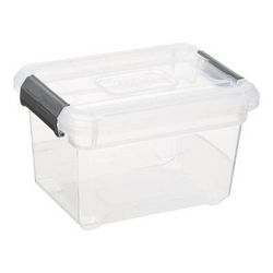 Informations Techniques : Dimensions : L. 19 x l. 14 x H. 11,8 cm Matières : Polypropylène Spécificités : Pratique & Utile Boîte de Rangement Forme Rectangulaire Poignées avec charnières Roues bidirectionnelles Contenance : 1,8 L Poids : 0,136 kg Couleur : Transparent
