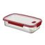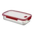 Boîte rectangle transparente en verre borosilicate 2,3 litres avec couvercle rouge hermétique. Le verre borosilicate est ultra résistant aux chocs thermiques et mécaniques. Grâce à cette boîte vous pourrez conserver et transporter facilement vos aliments et préparations. Compatible au micro-ondes et
