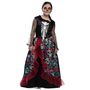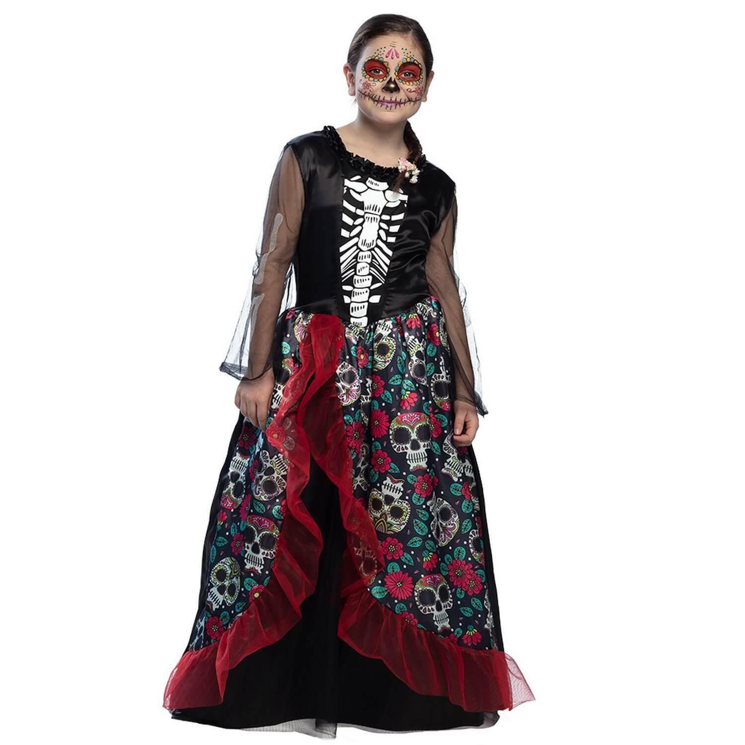 4/6 ans (104 à 116 cm) - Contenu : 1 robe.Cette robe est noire à manches longues. Elle va environ jusqu'aux pieds. Le bustier à un motif squelette blanc et les manches sont noires transparentes. Le col possède des petites fleurs noires. Le jupon de la robe est noire avec un étage supplémentaire à motifs de calaveras (têtes de morts mexicaines) colorées et de fleurs. Il y a également un volant rouge froncé. Age minimum : la naissance