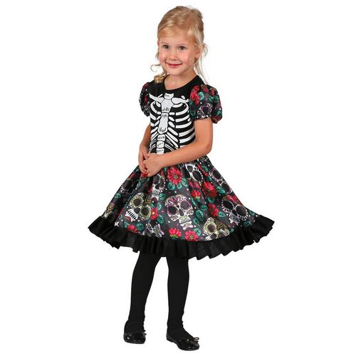 3/4 ans (96 à 104 cm) - Contenu : 1 robe.Ce déguisement se compose d'une robe à manches courtes. Le bustier de la robe est noir avec un dessin de squelette. Les manches sont bouffantes avec un tissu noir. Le tissu présente des motifs de fleurs rouges et des calaveras (têtes de morts mexicaines) colo