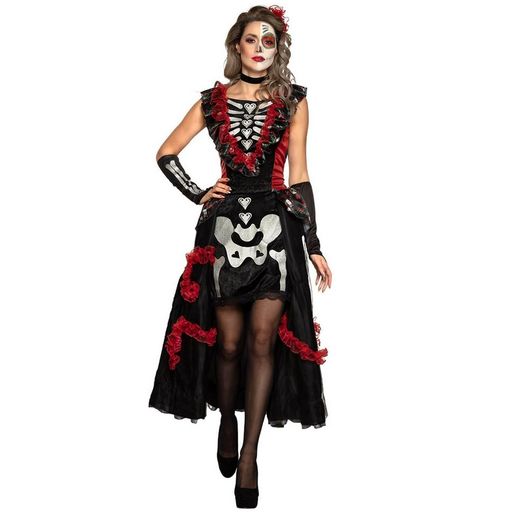 L - 40/42 - Contenu : 1 robe réversible, 1 accessoire cheveux, 1 collier, 1 paire de manchettes. Ce déguisement se compose d'une robe longue réversible. Le bustier ne change pas. Il est noir et rouge et laisse apparaître des motifs d'os de squelette blancs. Il y a également un tissu rouge et un tissu noir avec des dessins de calaveras froncés en forme de v. Le jupon est réversible. La première possibilité est de le porter en noir avec des détails de calaveras (têtes de morts mexicaines) colorées. La deuxième possibilité est de le porter noir avec des frous-frous rouge. Dans cette option le devant de la robe est court avec un dessin de squelette. Le déguisement vient également avec une paire de manchettes avec un dessin d'os du bras en blanc. Un collier noir ras de cou ainsi qu'une fleur rouge pour cheveux sont inclus. Age minimum : la naissance