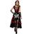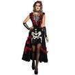XXL - 44/46 - Contenu : 1 robe réversible, 1 accessoire cheveux, 1 collier, 1 paire de manchettes. Ce déguisement se compose d'une robe longue réversible. Le bustier ne change pas. Il est noir et rouge et laisse apparaître des motifs d'os de squelette blancs. Il y a également un tissu rouge et un tissu noir avec des dessins de calaveras froncés en forme de v. Le jupon est réversible. La première possibilité est de le porter en noir avec des détails de calaveras (têtes de morts mexicaines) colorées. La deuxième possibilité est de le porter noir avec des frous-frous rouge. Dans cette option le devant de la robe est court avec un dessin de squelette. Le déguisement vient également avec une paire de manchettes avec un dessin d'os du bras en blanc. Un collier noir ras de cou ainsi qu'une fleur rouge pour cheveux sont inclus. Age minimum : la naissance