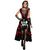 XXL - 44/46 - Contenu : 1 robe réversible, 1 accessoire cheveux, 1 collier, 1 paire de manchettes. Ce déguisement se compose d'une robe longue réversible. Le bustier ne change pas. Il est noir et rouge et laisse apparaître des motifs d'os de squelette blancs. Il y a également un tissu rouge et un ti