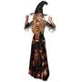 4/6 ans (104 à 116 cm) - Contenu : 1 robe et 1 chapeau.Le déguisement se compose d'une robe à manches longues. La robe va quasiment jusqu'aux pieds. Le bustier est noir avec un effet corsage et un tissu orange. Le jupon est noir et orange avec un effet flammes. Les manches sont en tissu transparent noir. Elles sont évasées et présentent un motif toile d'araignée. Un chapeau noir est également inclus. Il s'agit d'un chapeau pointu légèrement biscornu. Le tour du chapeau est dans un tissu noir transparent avec un motif toile d'araignée. Age minimum : la naissance