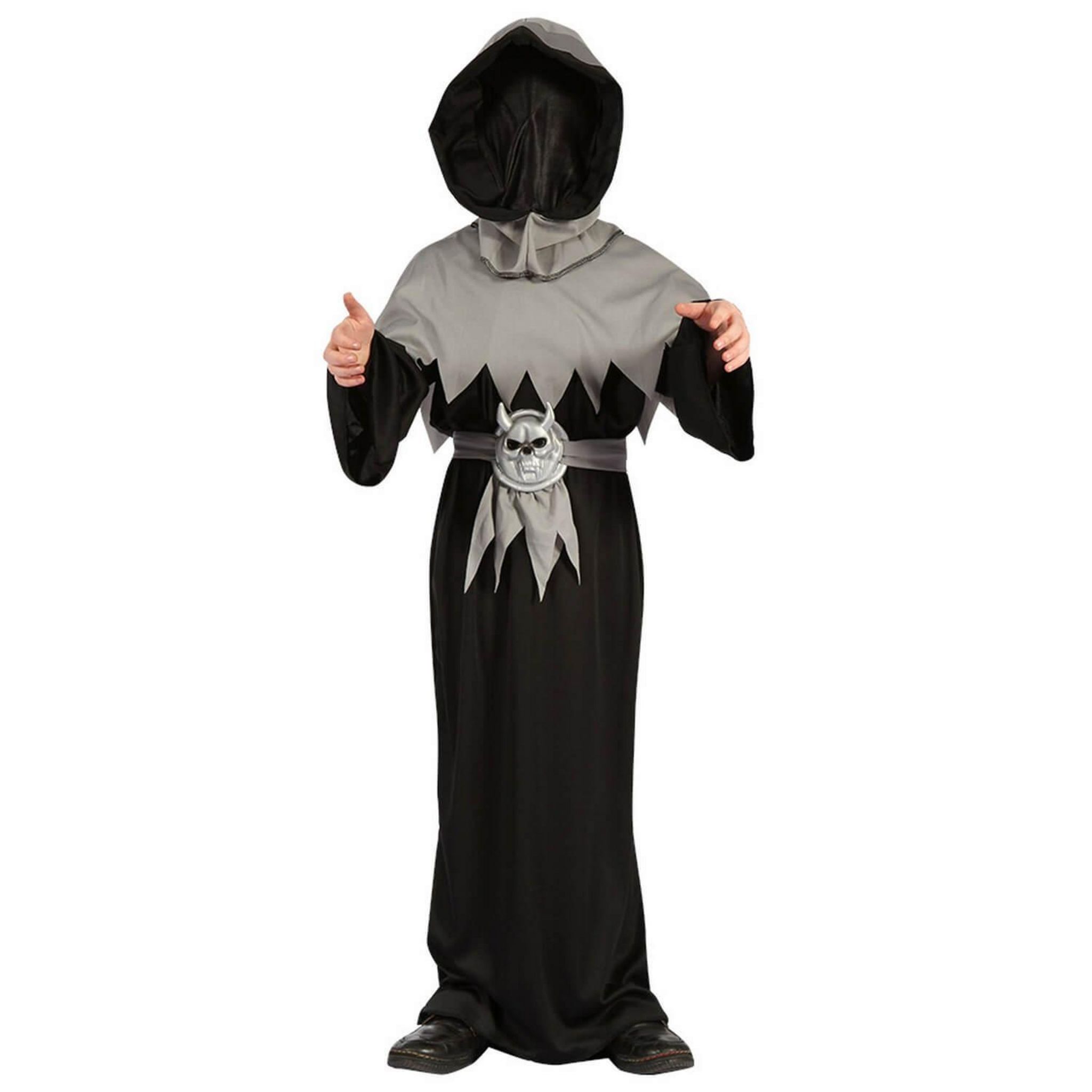 4/6 ans (104 à 116 cm) - Contenu : 1 capuche, 1 tunique, 1 ceinture.Ce déguisement se compose d'une grande tunique noire à manches longues. La tunique va quasiment jusqu'aux pieds.Il y a un tissu gris par-dessus la tunique avec un effet de découpes. Le déguisement vient avec une ceinture en tissu grise avec un visage de démon. Une capuche avec un masque est également incluse. La capuche est grise tandis que le masque est intégralement noir. Age minimum : la naissance