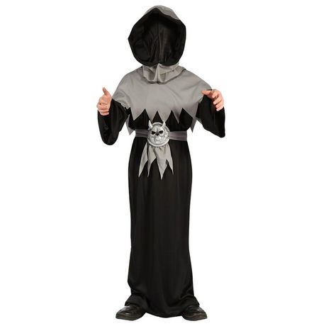 4/6 ans (104 à 116 cm) - Contenu : 1 capuche, 1 tunique, 1 ceinture.Ce déguisement se compose d'une grande tunique noire à manches longues. La tunique va quasiment jusqu'aux pieds.Il y a un tissu gris par-dessus la tunique avec un effet de découpes. Le déguisement vient avec une ceinture en tissu gr