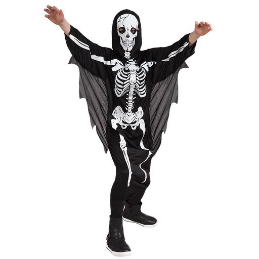 7/9 ans (122 à 134 cm) - Contenu : 1 capuche et 1 tunique.Ce déguisement se compose d'une tunique à manches longues noire. La tunique arrive environ au niveau des chevilles.Un dessin de squelette blanc est présent sur le devant. Un tissu noir transparent part des manches avec un effet déchiré. Une c