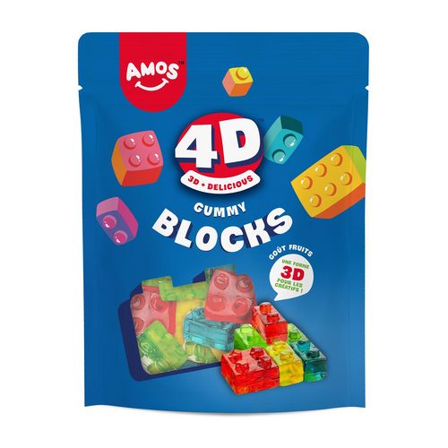 un bonbon moelleux au goût fruité avec une forme 3D inédite et créative de bloc de construction