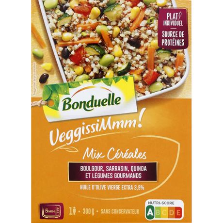 Avec Bonduelle, osez la gourmandise ! ix Céréales, un trio gourmand : des céréales + des légumineuses + des légumes Mélange de légumes, céréales et quinoa assaisonné à l'huile d'olive vierge extra (3,9%) surgelé
