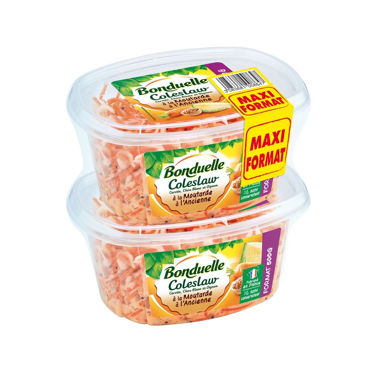 Ingrédients: Ingrédients : Choux blancs (44%), carottes (29%), eau, huile de colza, sucre, MOUTARDE à l'ancienne (1%)(eau, vinaigre d'alcool, graines de MOUTARDE, téguments, sel, arômes naturels, épice), vinaigre d'alcool, oignons, MOUTARDE de Dijon (eau, graines de MOUTARDE, vinaigre d'alcool, sel), sel, amidon transformé de pomme de terre, OEUFS en poudre, épaississants : E412-E415, anti-oxydant : acide ascorbique, arôme naturel de poivre. Fabriqué dans un atelier utilisant également : gluten, céleri, lait, crustacé, poisson, soja, fruits à coque.