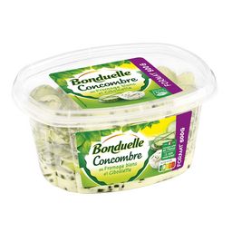 Concombres 79%, huile de colza, eau, FROMAGE blanc 40% de matières grasses 2,5% (LAIT pasteurisé, CREME pasteurisée, ferments LACTIQUES), CREME fraîche (crème de LAIT pasteurisé, ferments LACTIQUES), sel, vinaigre d'alcool, ciboulette 0,8%, purée d'ail, MOUTARDE de Dijon, persil, OEUF en poudre, épaississant : gomme de xanthane. Fabriqué dans un atelier utilisant également: gluten, crustacé, poisson, céleri, soja, fruits à coque.