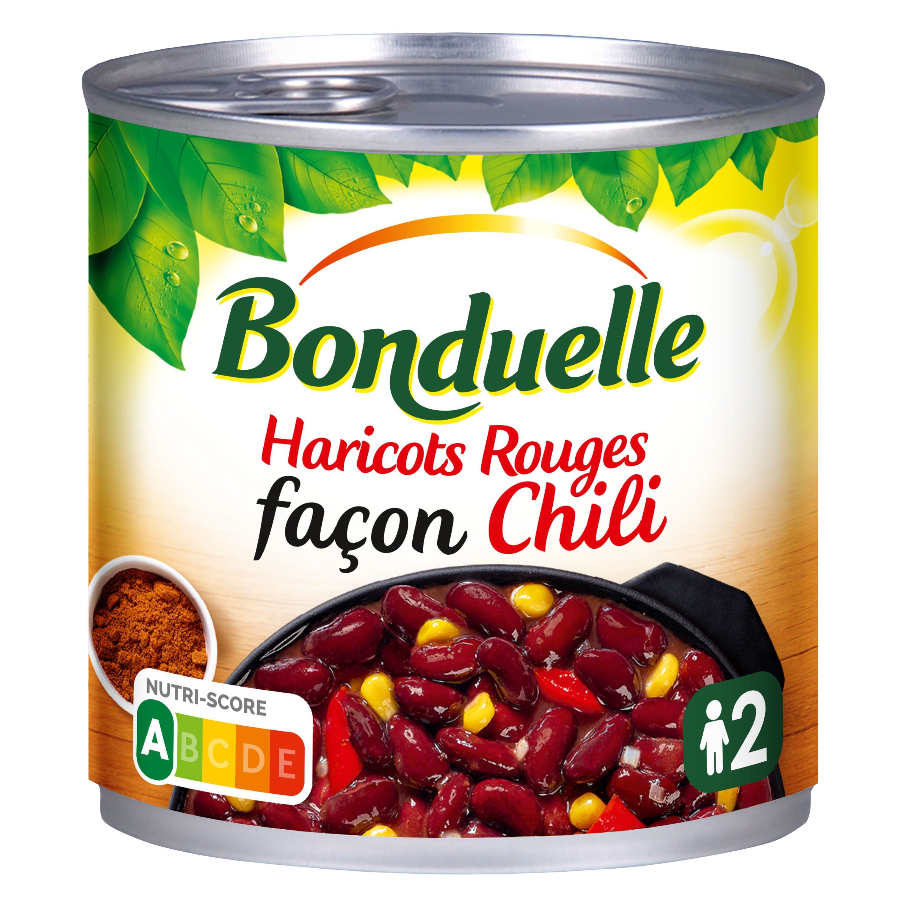 Eau, haricots rouges secs trempés 38.4%, maïs doux en grains 8.6%, poivrons rouges 4.3%, oignons 2.7%, double concentré de tomates, sel, MOUTARDE (eau, graines de MOUTARDE, vinaigre d'alcool, sel) 0.5%, cumin 0.3%, oignons en poudre 0,1%, tomates en poudre, paprika 0,1%, ail en poudre, paprika fumé 0,09%, piments 0,04. Peut contenir GLUTEN, SOJA