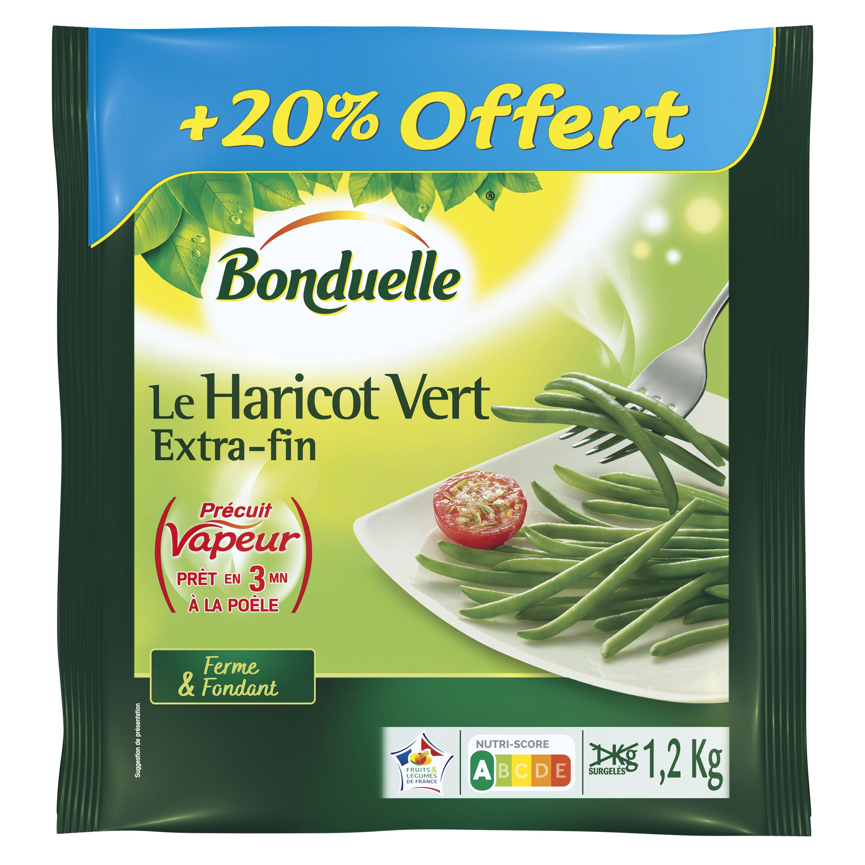 Avec la gamme précuit Vapeur Bonduelle, retrouvez dans votre assiette le goût et les qualités des légumes frais en seulement 3 minutes. Ces haricots verts ont été cultivés en France. Ils ont été cueillis, précuits à la vapeur et surgelés dans la journée. Pour la fabrication de nos emballages, nous utilisons deux fois moins d'encre et 25% de plastique en moins.