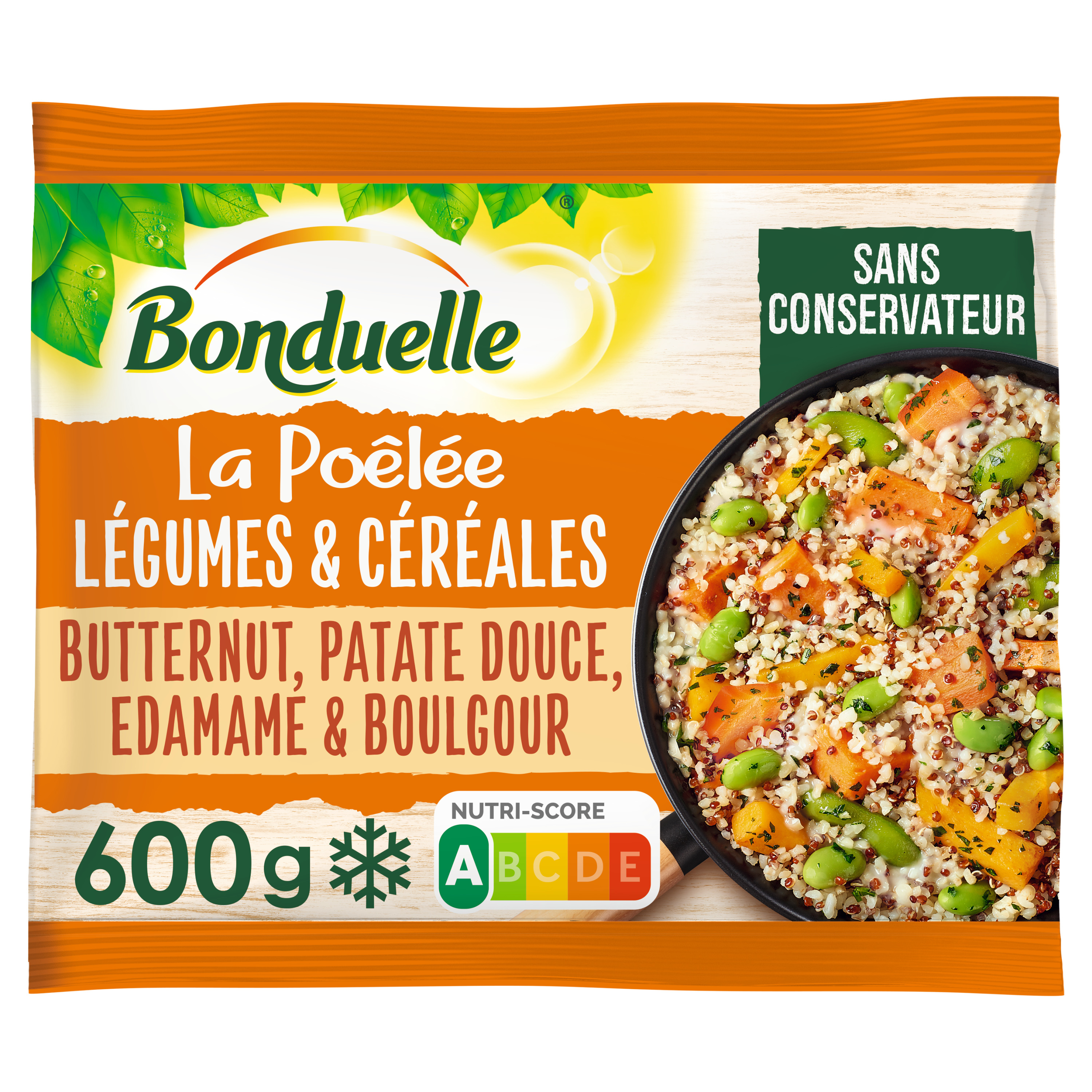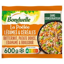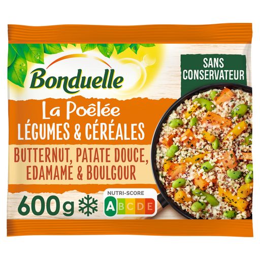 Ingrédients : Ingrédients:pCourge butternut 22%, bBOULGOUR/b précuit (bBLE/b) 15%, pois gourmands 12%, patate douce 11%, carottes, fèves de bSOJA/b edamame 9%, eau, quinoa rouge précuit 4,8%, bCREME/b fraîche 2,6%, huile de tournesol, farine de bBLE/b, persil 0,7%, sel, arôme naturel, extrait de levure./pp /ppPeut contenir du bCELERI /b/pp /p