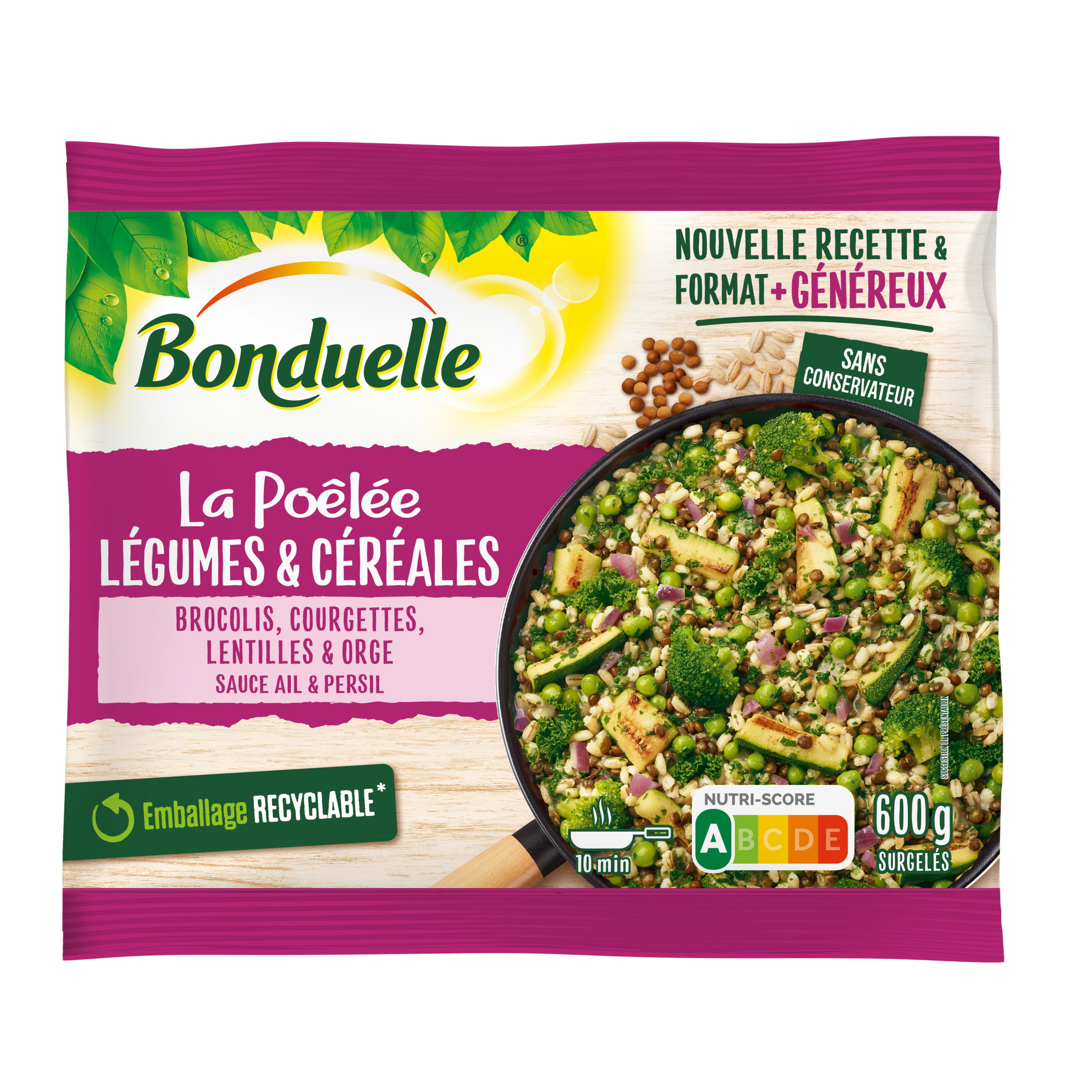 Courgettes grillées 16%, brocolis 15%, petits pois doux 14%, lentilles 13%, ORGE perlé cuit 10%, oignons rouges, chou palmier (kale) 9%, eau, huile de tournesol, mélange de FROMAGES râpés (LAIT pasteurisé, sel, coagulant microbien), farine de BLE, persil 0,6%, sel, ail 0,4%, cerfeuil, jus de citron concentré, extraits de levure, maltodextrine de pomme de terre, jus concentrés de légumes et d'aromates (tomate, courgette, carotte, poivron rouge, oignon, fenouil, ail), huile d'olive, arôme naturel