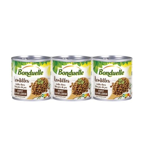 Ingrédients : Ingrédients:Lentilles [vertes] sèches trempées, eau, sel, affermissant : chlorure de calcium