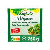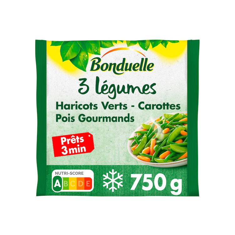 Avec la gamme Les 3 légumes Précuits Vapeur Bonduelle, retrouvez dans votre assiette le goût et les qualités des légumes frais en seulement 3 minutes. Cette recette composée d'haricots verts, de pois gourmands et de carottes va ravir vos papilles !