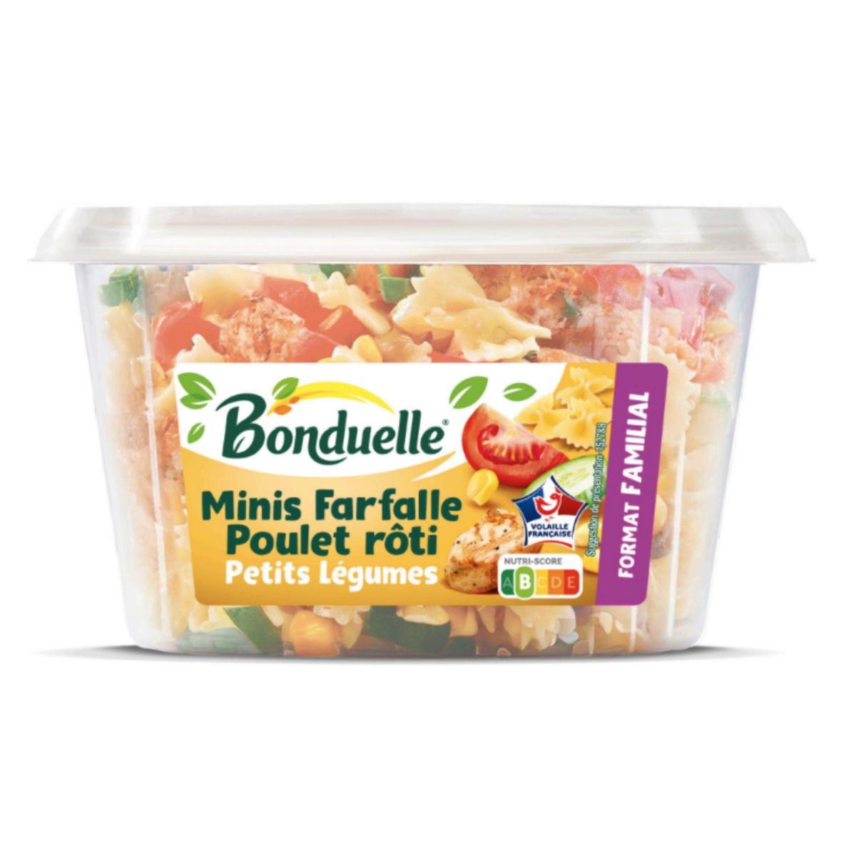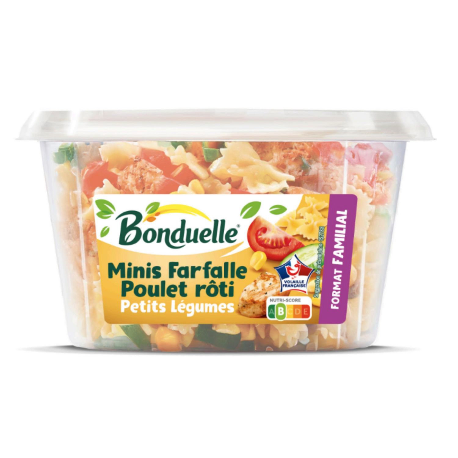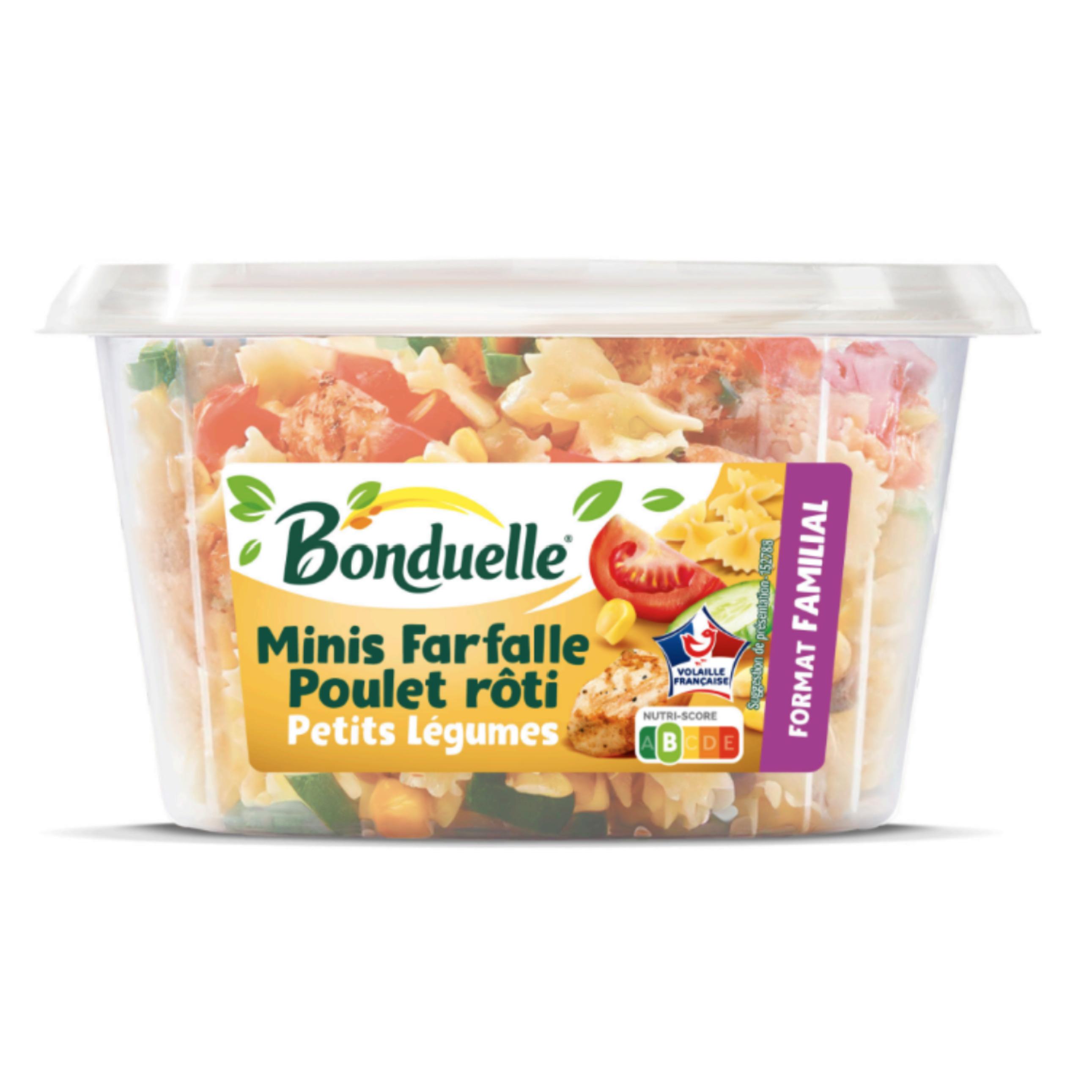 Ingrédients : Ingrédients:Pâtes cuites 27% (eau, semoule de BLE dur, OEUFS frais), concombre 16%, maïs doux 16%, tomate 16%, viande de cuisse de poulet traités en salaison rôtie 8% (viande de cuisse de poulet* 7%, eau, dextrose, fécule de manioc, sel), eau, huile de colza, vinaigre d'alcool, purée d'ail, MOUTARDE à l'ancienne, sel, MOUTARDE de Dijon, épaississants: gomme de xanthane et gomme de guar, OEUF en poudre,